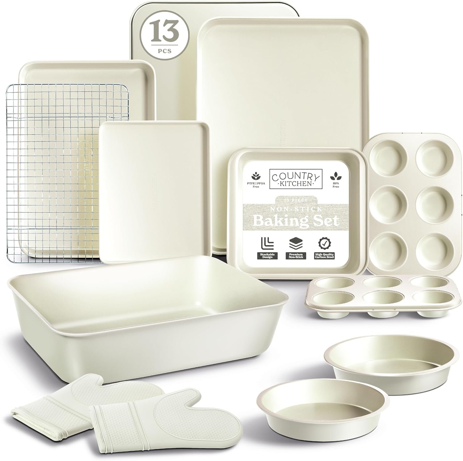 Professional 13-Piece Set – This all-in-one bakeware collection includes cookie sheets, cake pans, a cooling rack, and durable oven mitts, providing everything you need for baking and cooking like a pro.