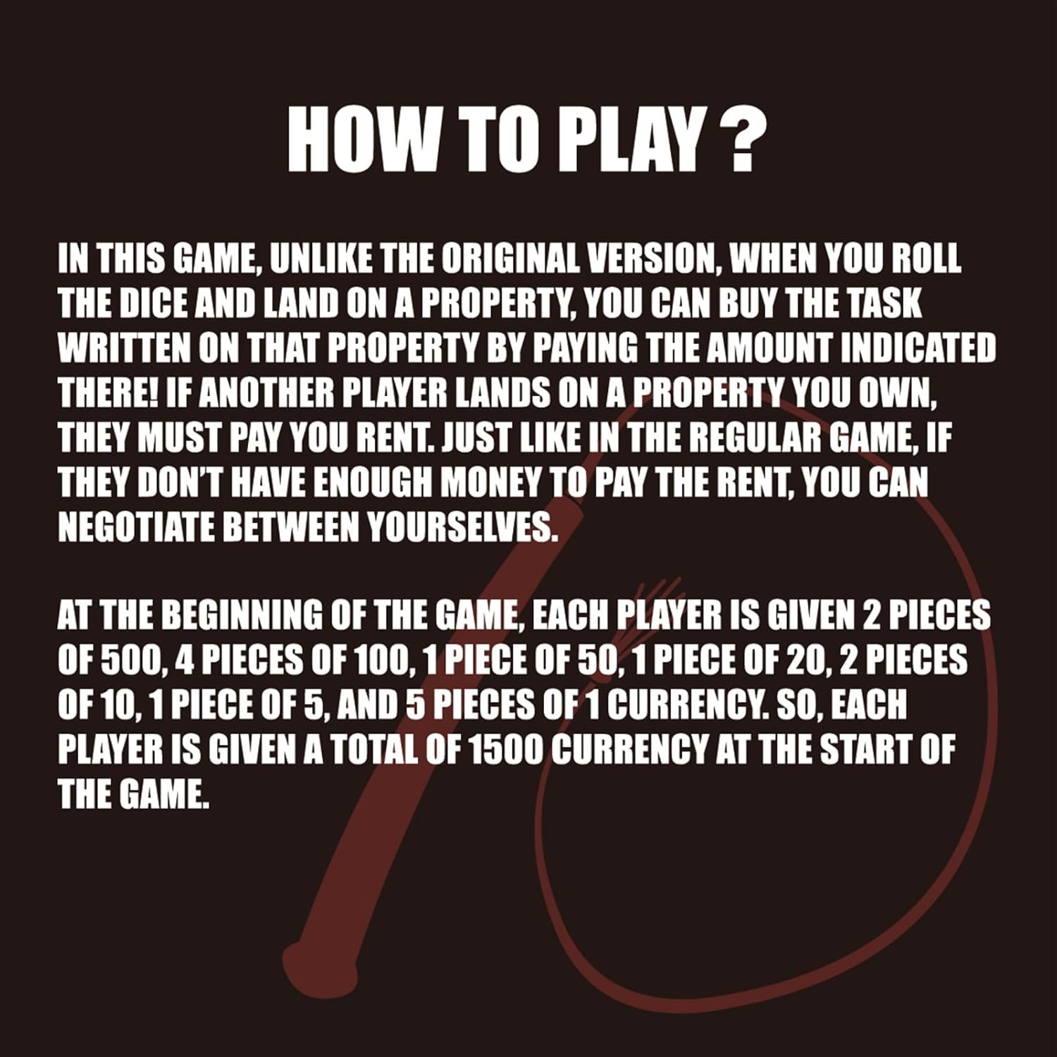 Date Night Game: Unlike traditional games, this one allows you to purchase tasks based on where the dice land. When you acquire a task, your partner must complete it. If they land on your purchased area in the next round, they’ll pay you rent for that area. This unique format lets you accumulate more funds to buy additional tasks and increase your strategic advantage!
