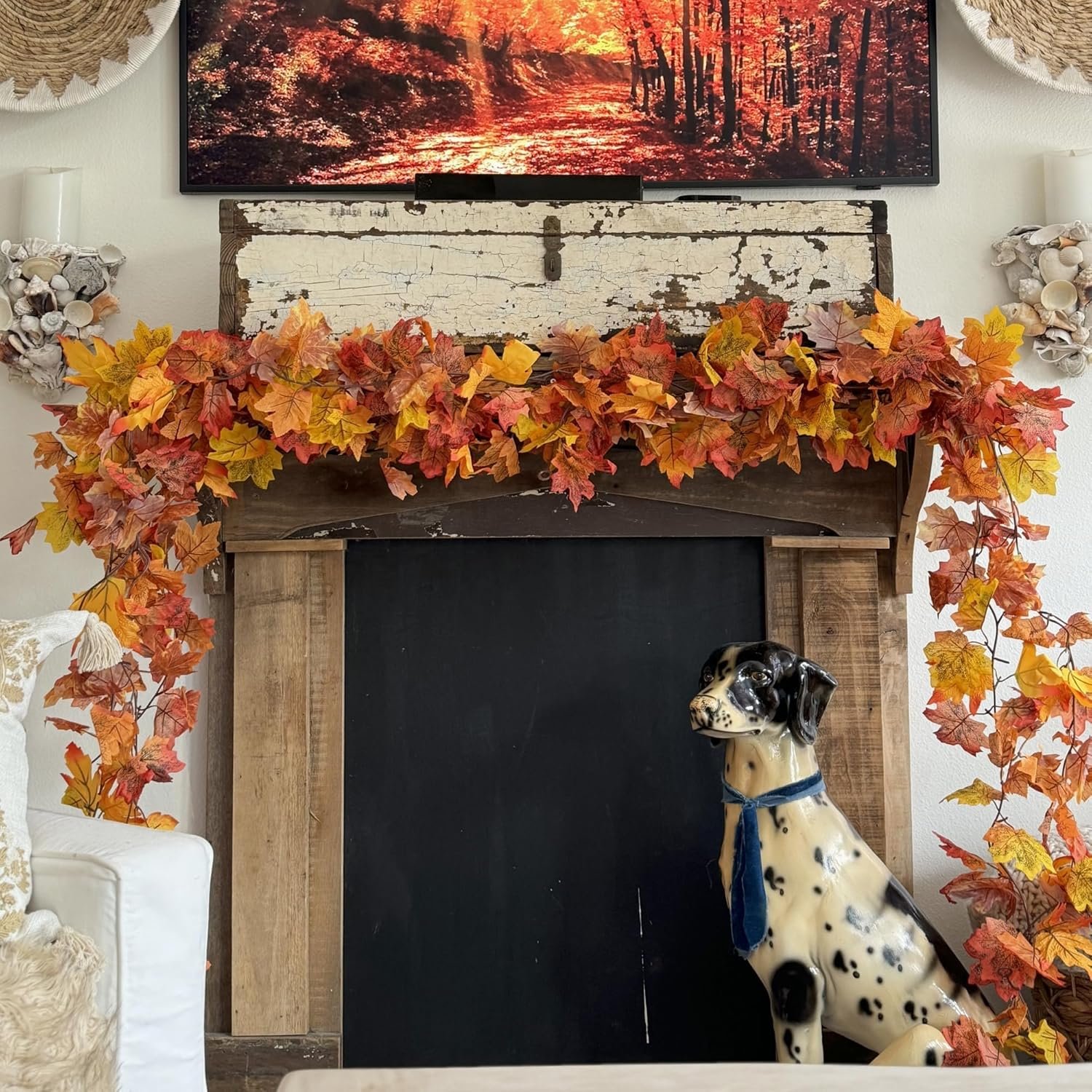 🍁CRAFTSMANSHIP🎃: Realistic Fall Leaves Garland.The color of the maple leaves range from dark green to vibrant orange, look like the real fallen leaves.The orange, yellow, and red and more color maple leaves make for a great blend of colors to warm up any room.Not fading,UV resistant , not falling off, good wear resistance,Non-flammable.