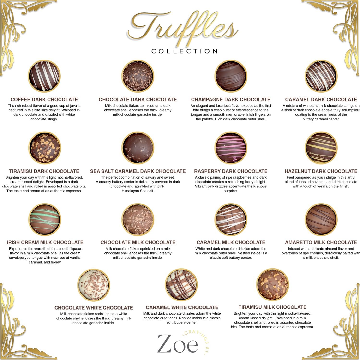 Handcrafted in the USA: Our Craving’s By Zoe chocolate truffles are meticulously handcrafted by our skilled chocolatier in New Jersey, USA. Using our cherished family recipe, we create a velvety rich assortment of dark chocolate candy, milk chocolate, and white chocolate truffles that will captivate your taste buds.