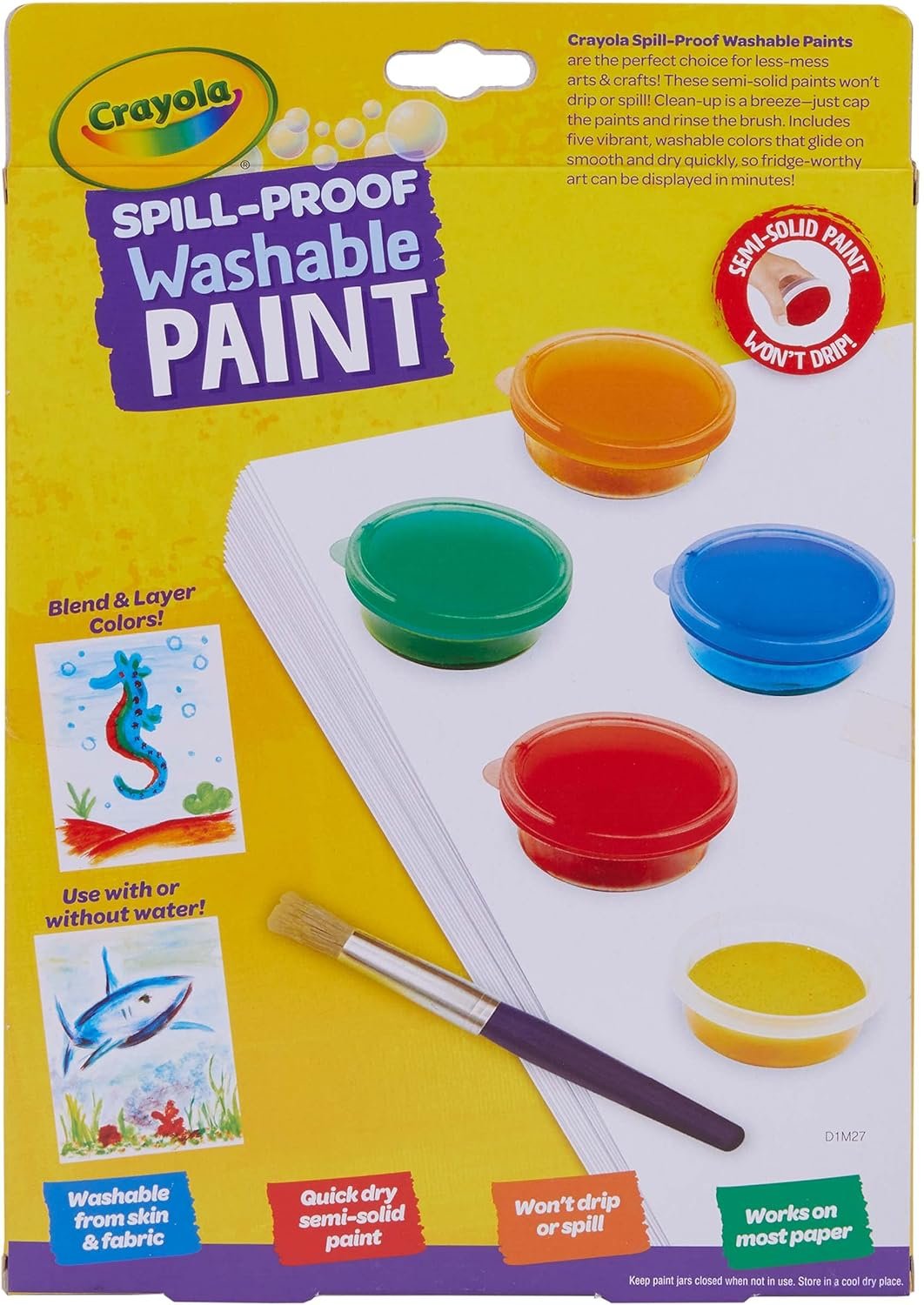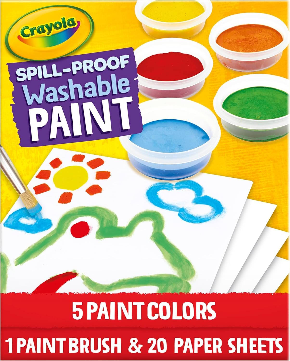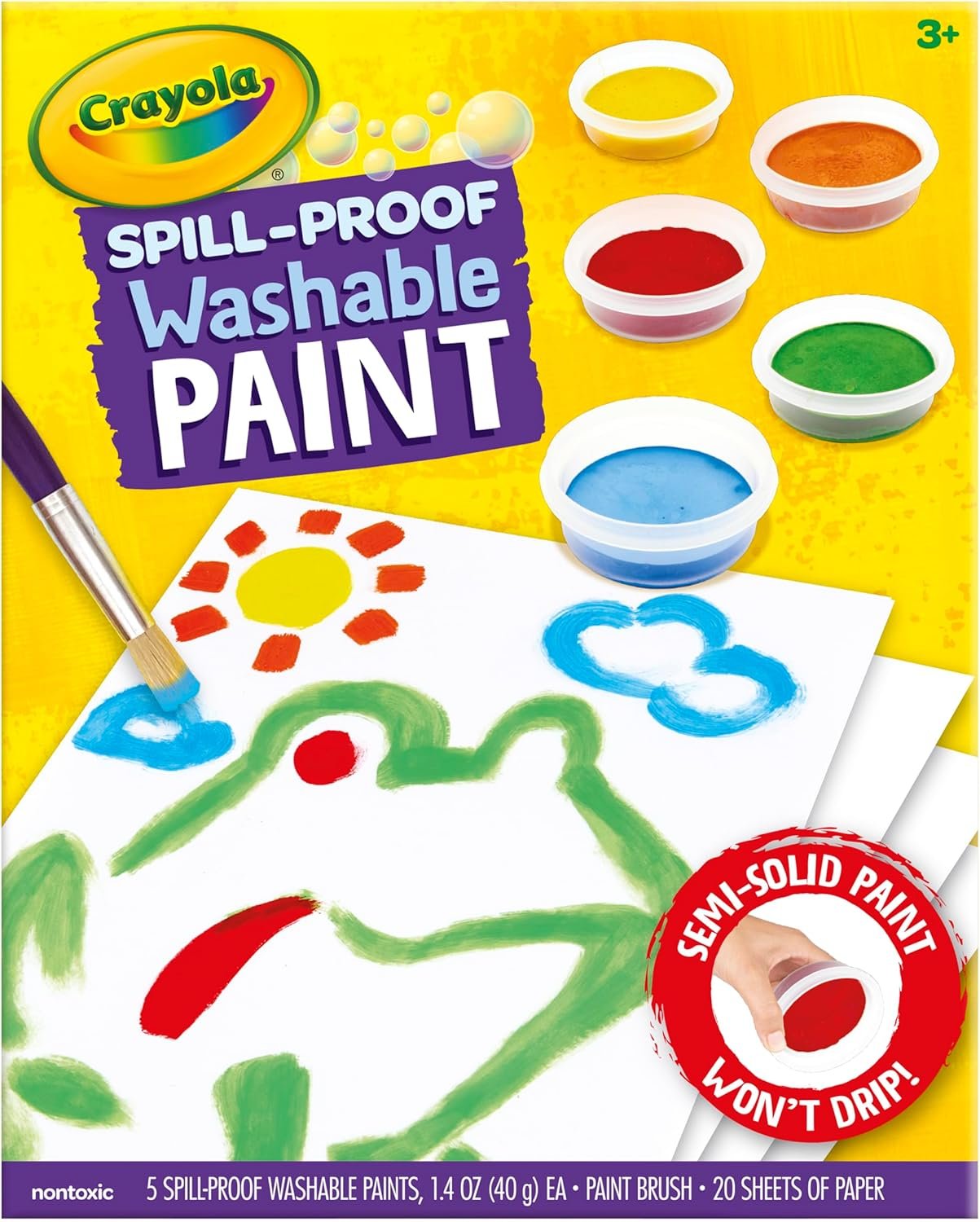 Keep craft time simple with Crayola Spill Proof Washable Paints! This less mess paint set features 5 Jars of Spill Proof Paint (40mg each), 1 Paint Brush, 20 Sheets of Paper, and 1 Instruction Sheet. Unlike traditional paints, Crayola Semi Solid Paints prevent spills, drips, and messes. Even better, these kids paints require little set up or clean up to use. When changing colors, simply wipe the brush on a damp cloth to keep your palette clean. Paint colors work well on most paper and dry quickly to prevent smearing. Makes a great holiday or birthday gift for kids. Safe and nontoxic, ages 3 and up.