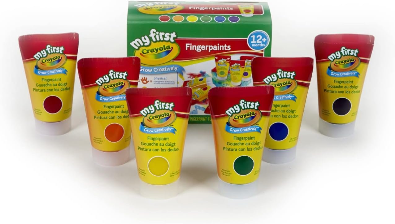 CRAYOLA FINGER PAINTS: This set of washable finger paints for kids includes 8oz bottles of Blue, Yellow, Orange, Green, Violet and Red finger paint