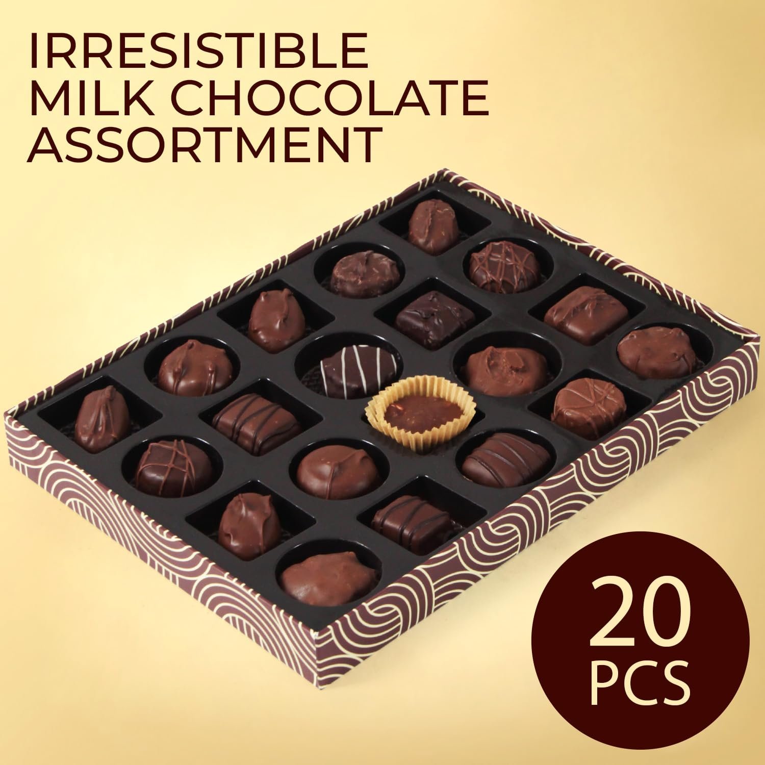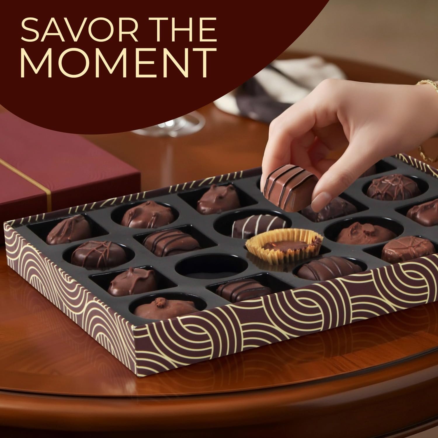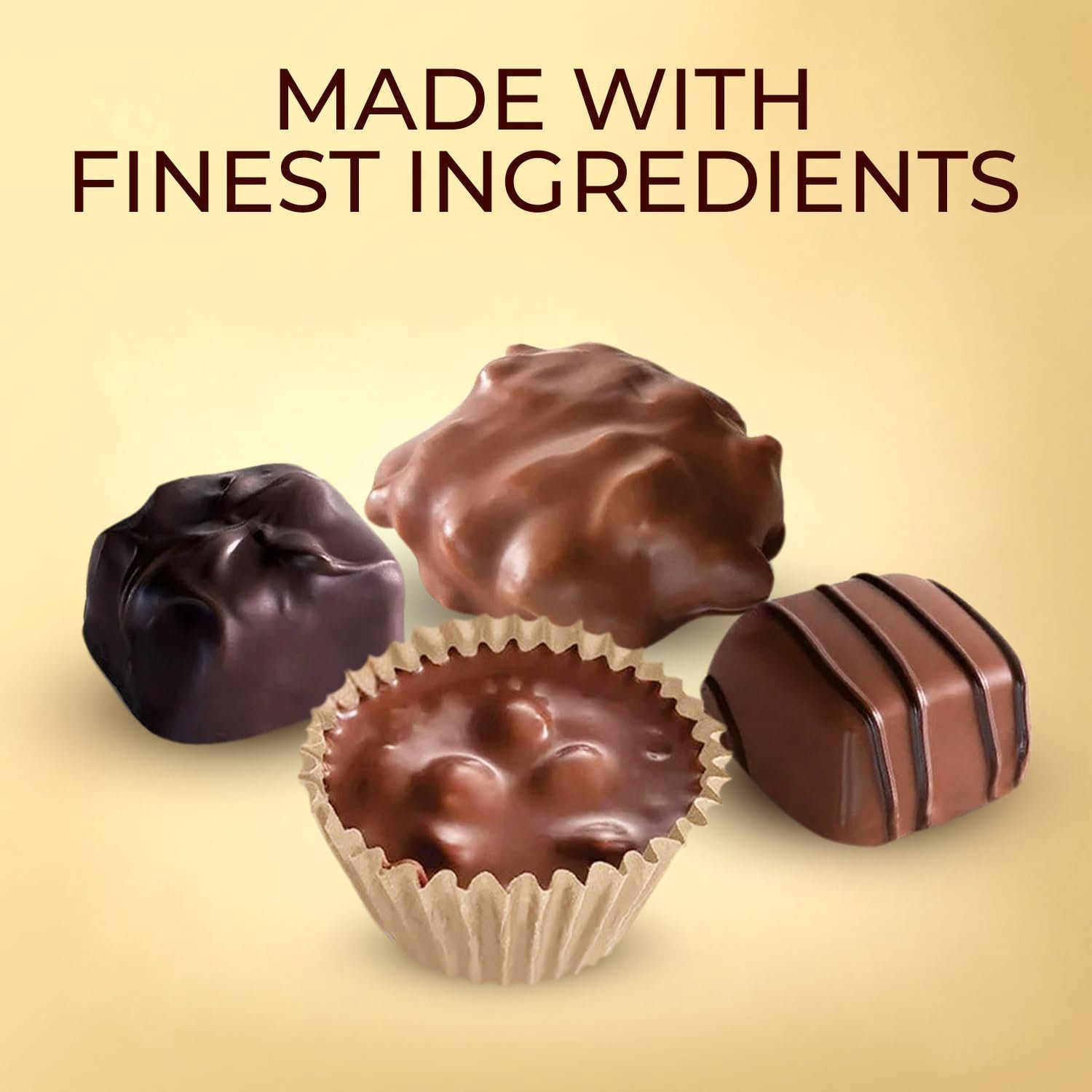 Assorted Gift Box Variety: Inside this chocolates gift box, you’ll find a masterfully arranged chocolate assortments that caters to every preference. Savor the milk chocolate truffle, the indulgent dark chocolate caramel, the crunchy milk chocolate pecan delight and the classic peanut cluster. Completing the variety are milk chocolate maple nut butter and fruity milk chocolate raspberry creme.