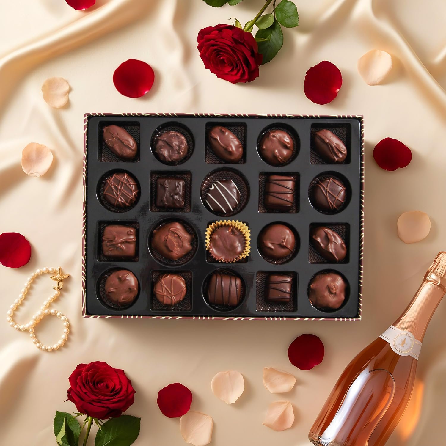 Luxury Chocolate Gift Box: Indulge in the elegance of the Cremelle valentines chocolate gift box, a thoughtfully curated 20pcs gift basket that combines gourmet chocolate craftsmanship with variety and luxury. This chocolate gift basket is ideal for sharing, savoring or gifting, presenting an unforgettable way to enjoy both milk and dark chocolate creations in one exclusive collection.