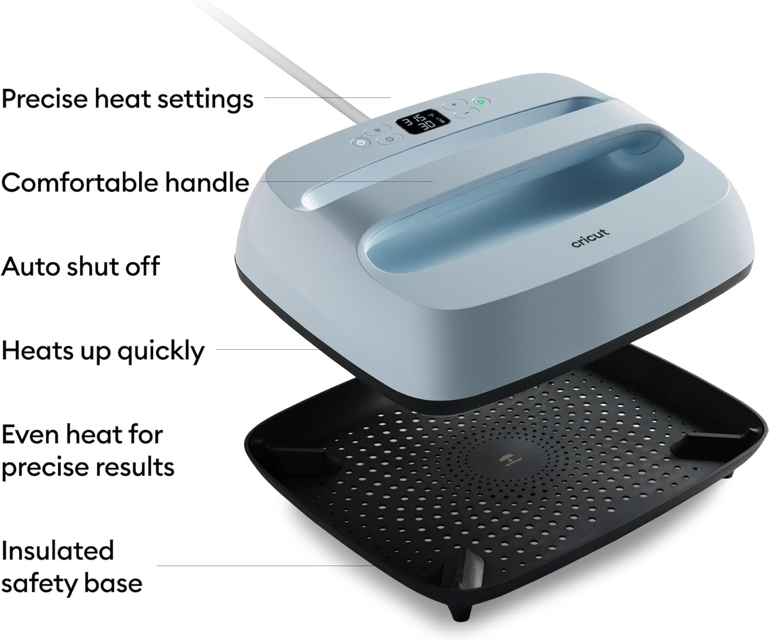ADJUSTABLE TIME & TEMPERATURE — Control temperature up to 400 ºF (205 ºC) and set the timer manually or use the Cricut Heat app to send precise settings. Apply gentle pressure and release when you hear the beep.