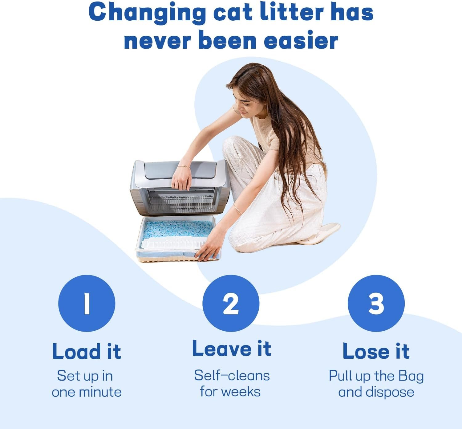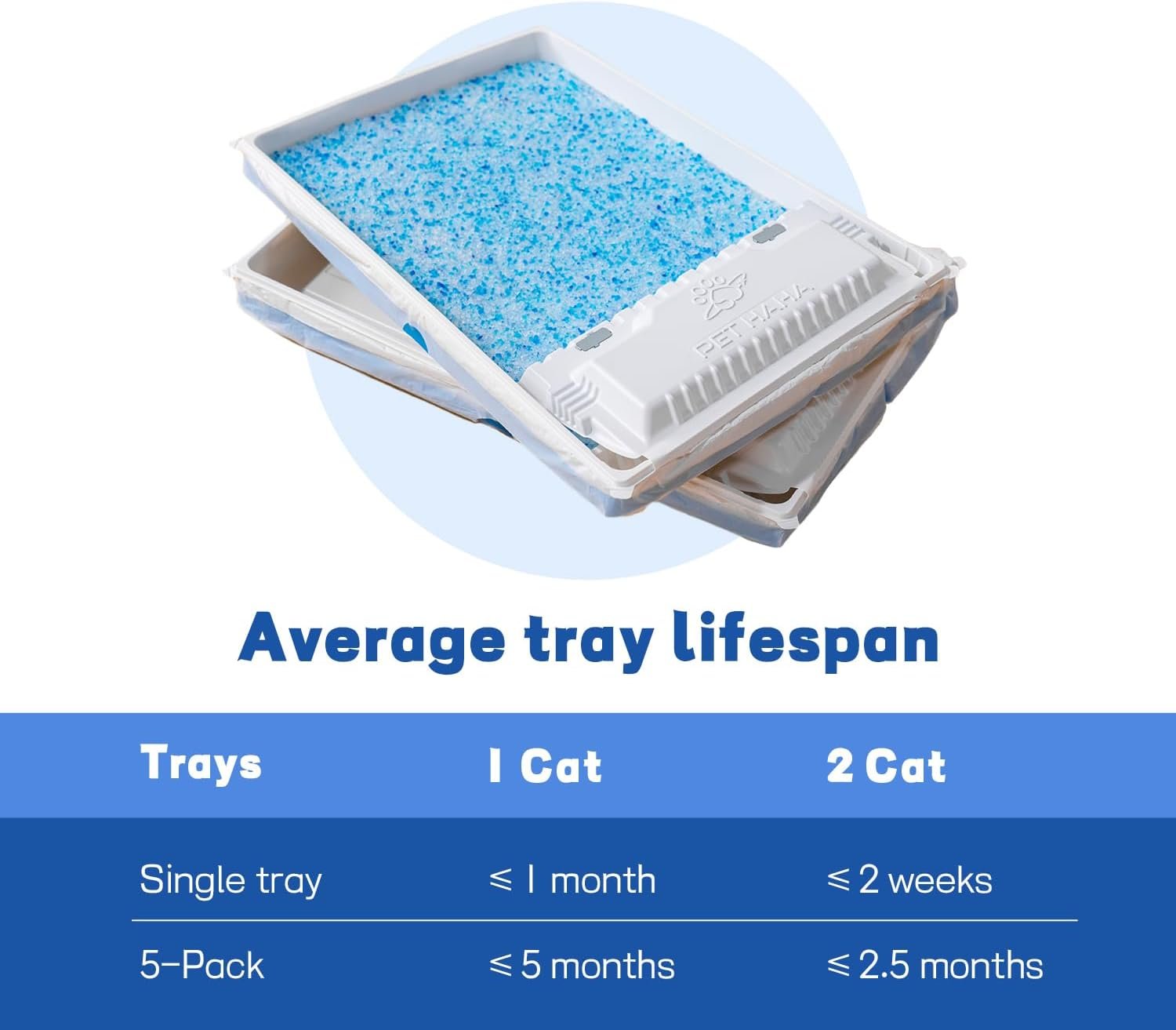 1) PET HAHA No-Scoop Cat Litter and Disposable Trays (5 Sets): This litter tray is custom-made to be Compatible with Petsafe Scoop-Free Self-Clean Litter Boxes, providing a snug and secure fit. You will get: Base which can be reused for supporting x 1, No-Scoop Crystal Litter x 5, Disposable Trays x 5, Drawstring bags x 5.