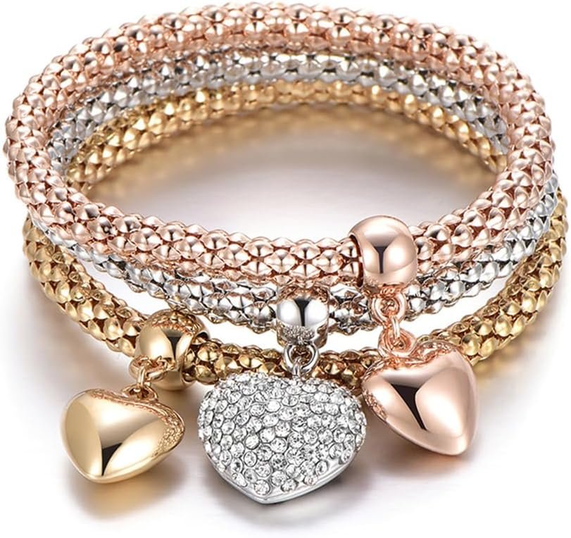 Crystal Charms Multilayer Bracelets – 3PCS Gold/Silver/Rose Gold Corn Chain Bracelet for Women, Tree of Life Heart Shaped Stretch Bracelet