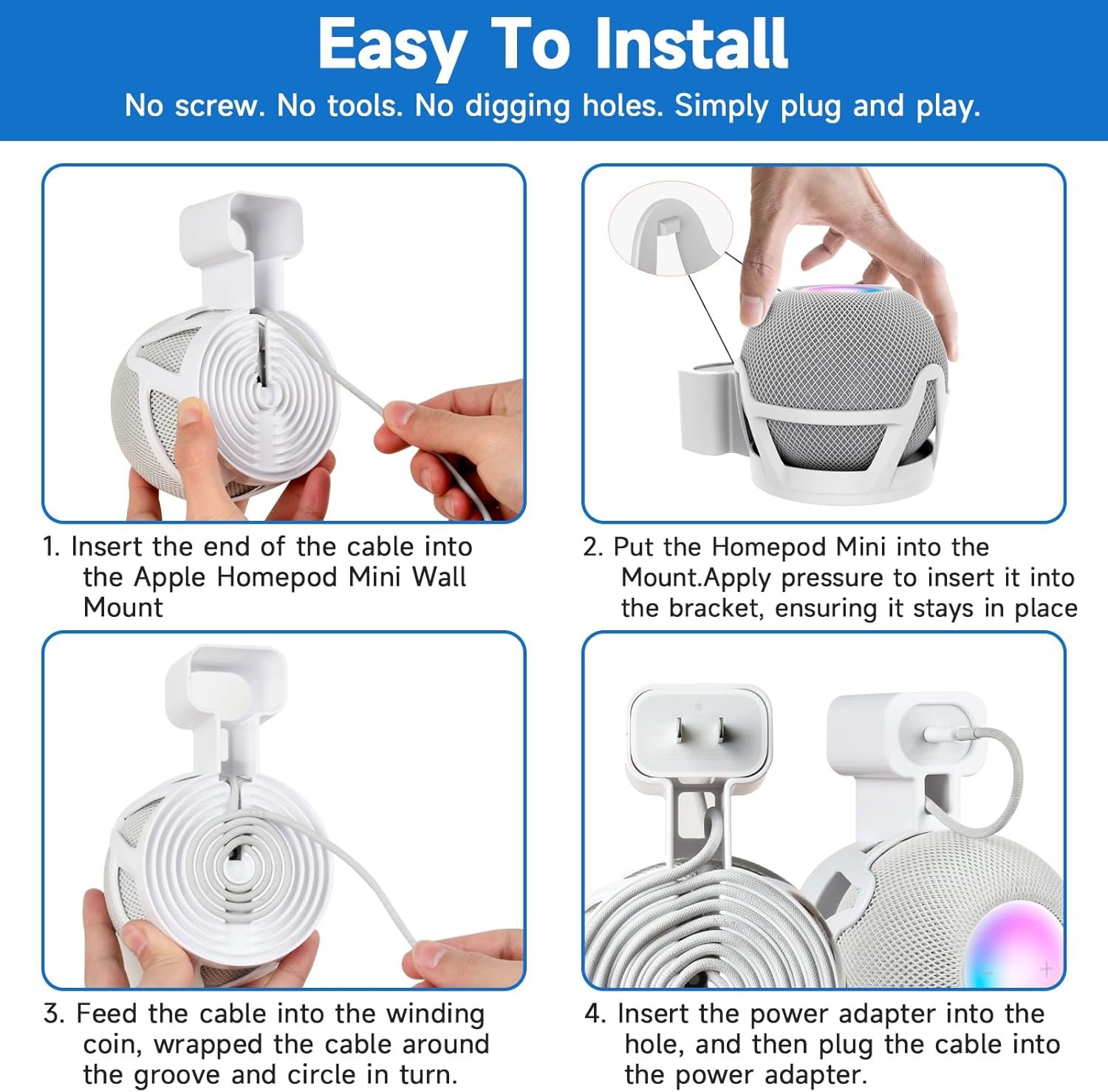 Easy to Install – No drilling holes or screwing. Just plug your Homepod Mini into the outlet wall mount stand, and then wrap cords around the reel and hide them perfectly on the back of the bracket made for HomePod Mini.