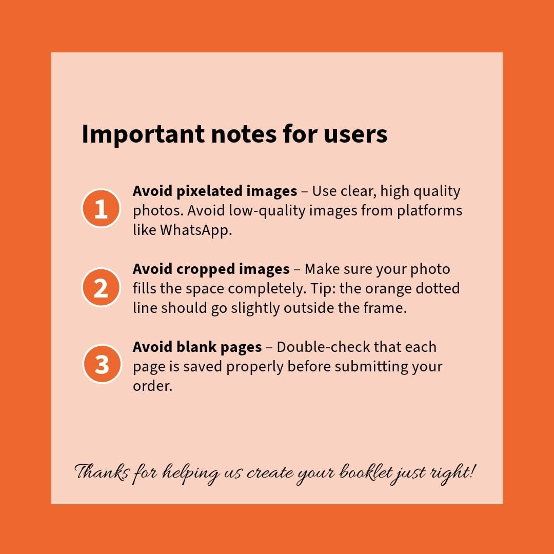 Avoid pixelated images – Use clear, high-quality photos. Avoid low-quality images from platforms like WhatsApp.Avoid cropped images – Make sure your photo fills the space completely. Tip: the orange dotted line should go slightly outside the frame.Avoid blank pages – Double-check that each page is saved properly before submitting your order.NOTE FOR MOBILE USERS: To fill the frame, click on the uploaded photo. You’ll see an orange grid around the image. Now use two fingers to zoom in, rotate or shift the image.