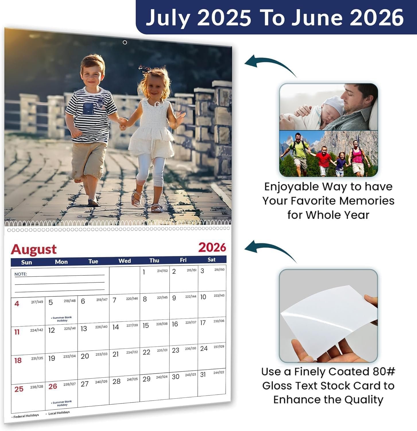 Capture your precious moments all year long with our Custom Photo Wall Calendar 2026! Perfect for home, office, or as a unique personalized Christmas gift, this calendar lets you print 13 of your favorite memories (12 months + cover). Each month becomes a beautiful showcase of your life’s highlights. Our high-quality, thick matte paper ensures vibrant photo reproduction and durability. Easy-to-use online customization tool lets you design in minutes. Includes US holidays, spacious date boxes for notes, and a sturdy hanging loop. An ideal, heartfelt gift for family, friends, or clients. Satisfaction guaranteed with our 30-day return policy. Package: 1 custom calendar.