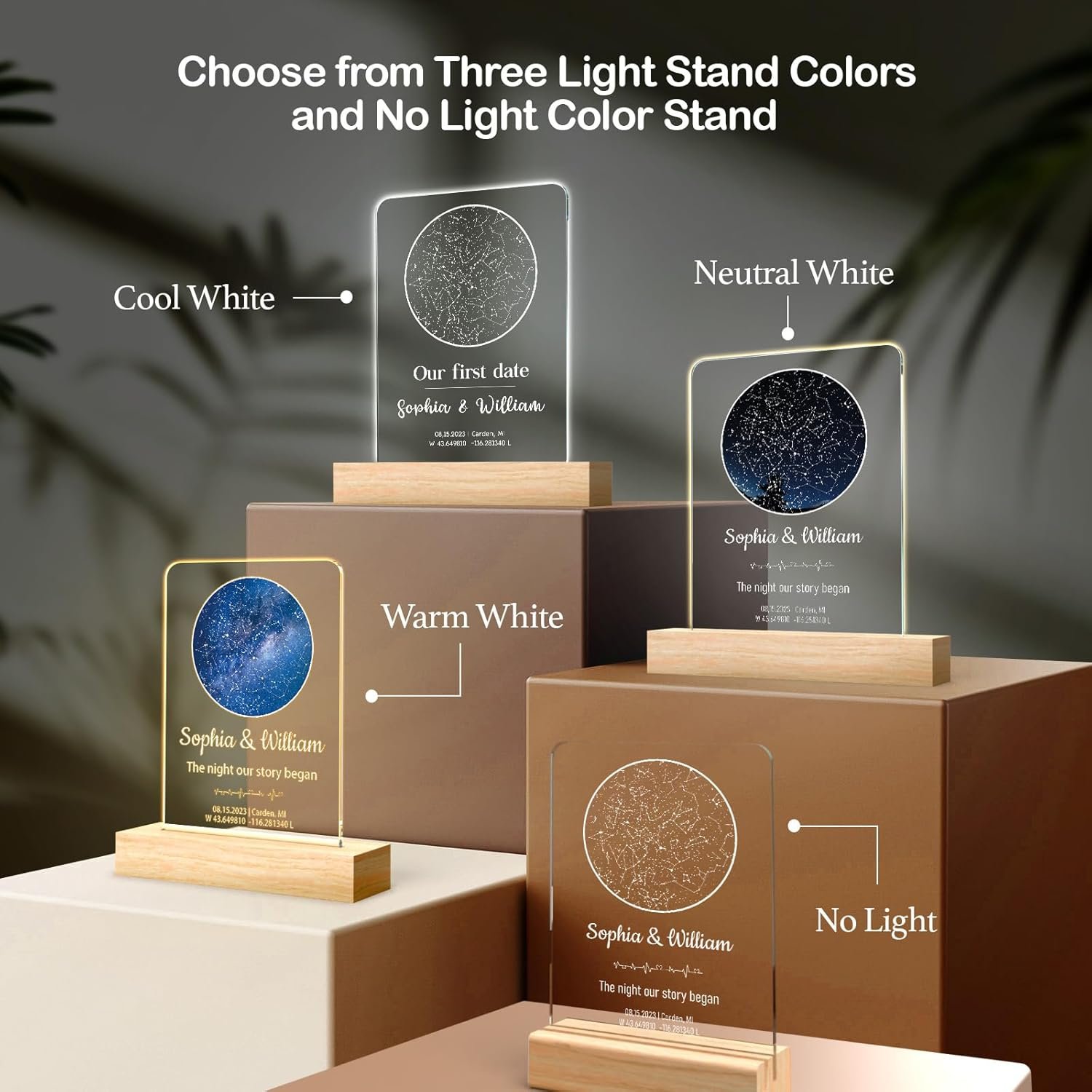 ✅ Illuminate Your Room: Choose from 3 lighting options—3-color transition, cool white, and warm white—to enhance your personalized star map. Available in two sizes to suit your preference, this glowing custom star map will light up your room and your heart. Non-lit options are also available.