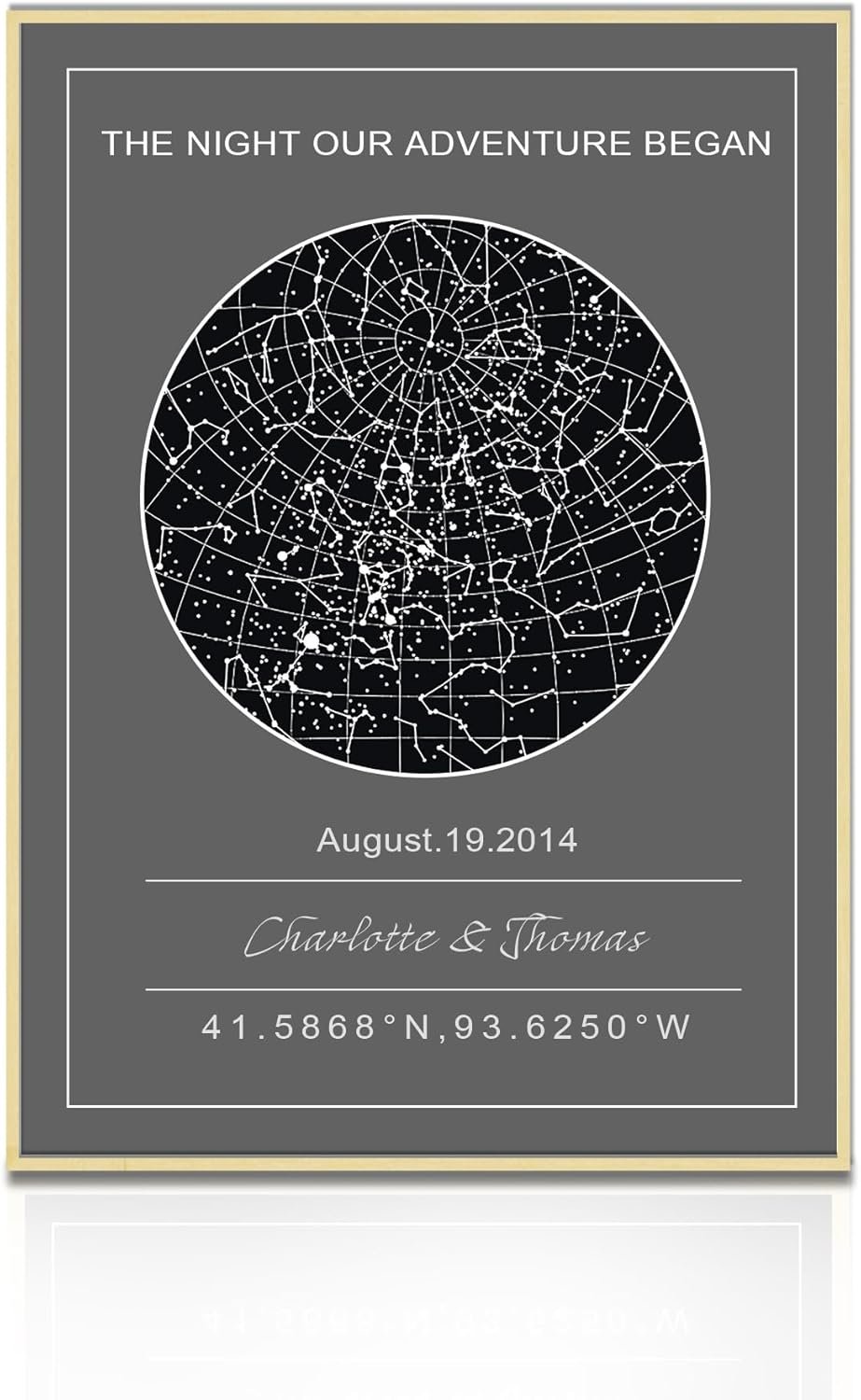 Our star map custom art prints capture the stars of your most memorable moments. As unique as a fingerprint, each personalized star map is a one of a kind cosmic signature of your special day captured in the precise alignment of the constellations, stars, moon, planets, and Milky Way in the heavens above your particular location. Remember the night of a magical proposal, a beautiful wedding, a special anniversary, an adoption, or the birth of a loved one in a truly unique way. Whether you are looking for customizable gifts for him, personalized gifts for her, or unique gifts for couples, the star maps are timeless and sentimental gifts that celebrate cherished moments under a constellation-dotted night sky.
