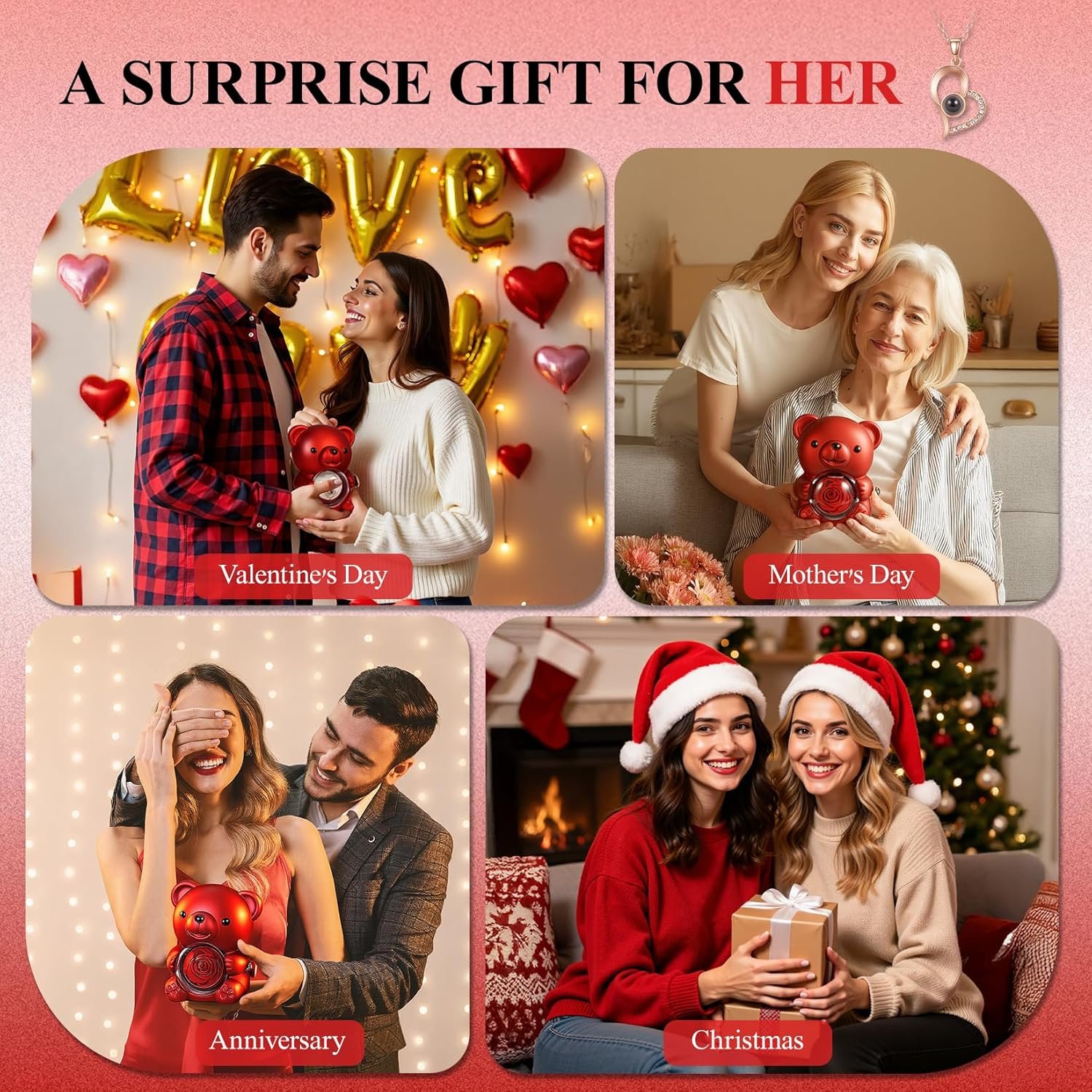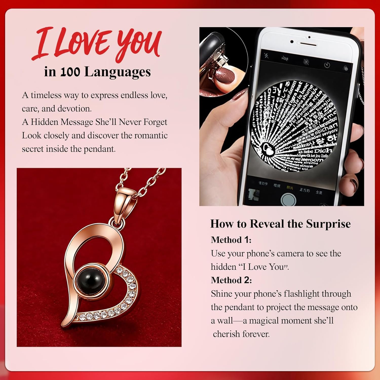 Rotating Hidden Surprise Necklace: Turn the gold knob to open a secret necklace compartment. The elegant projection necklace displays “I Love You” in 100 languages when illuminated with a light or viewed through a phone camera—an unforgettable romantic surprise she will never expect.