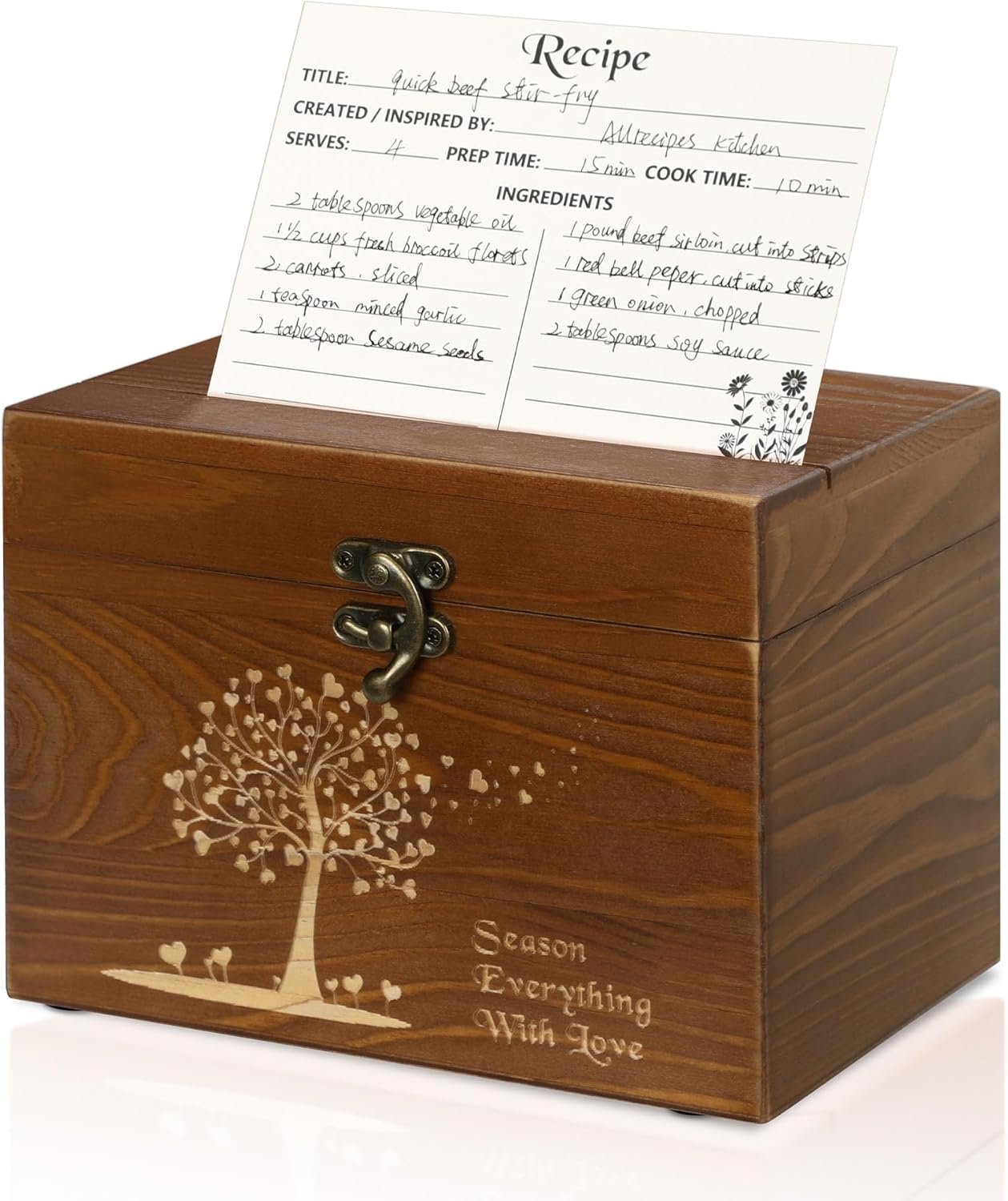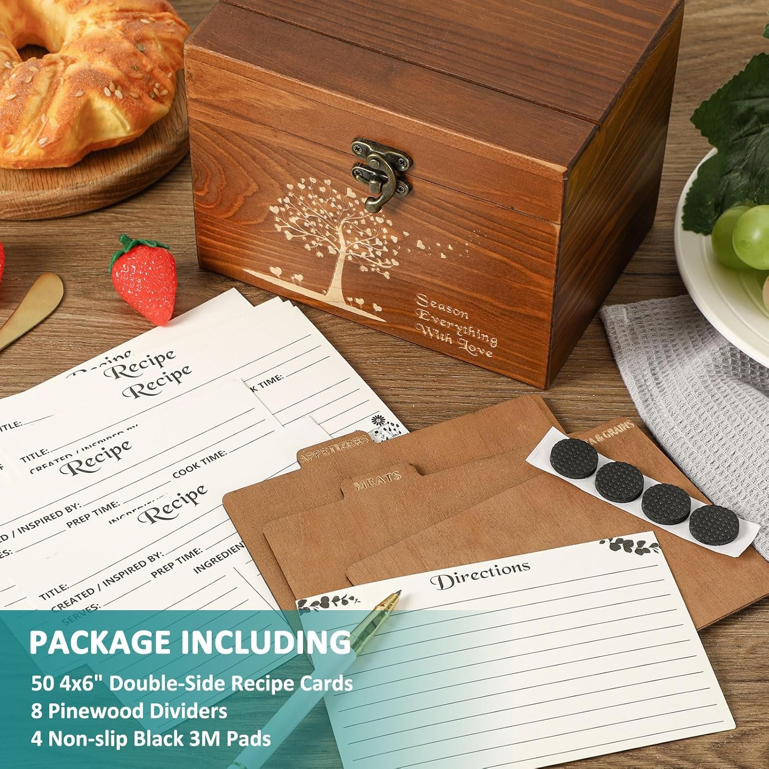 PINEWOOD RECIPE BOX- The CypherX recipe box is made of natural solid pine wood and coated with a smooth vintage brown color finish. It features a heavy-duty metal clasp and hinge for durability and sturdiness. It measures 6.89×4.92×5.12″. The package includes 4 non-slip pads for the bottom.