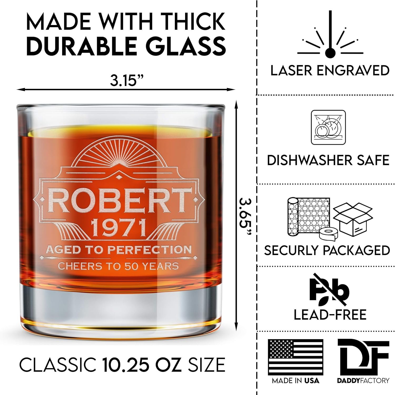 PERMANENTLY LASER ENGRAVED – Using modern laser etching technology, our custom whiskey glasses are laser etched to create a permeant engraved design that is permanent and also dishwasher safe.