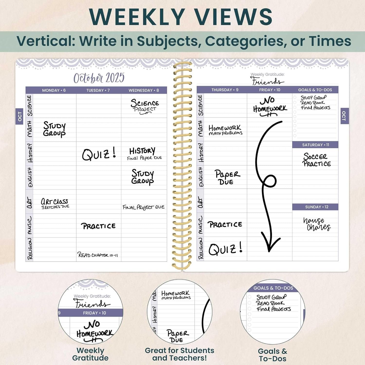 MONTHLY VIEWS & VERTICAL WEEKLY SPREADS: 2 page monthly overview spreads are followed by vertical weekly pages that run Monday to Sunday with space for 7 class subjects per day. Each weekly spread features a spot for gratitude and a section for goals & to-dos.