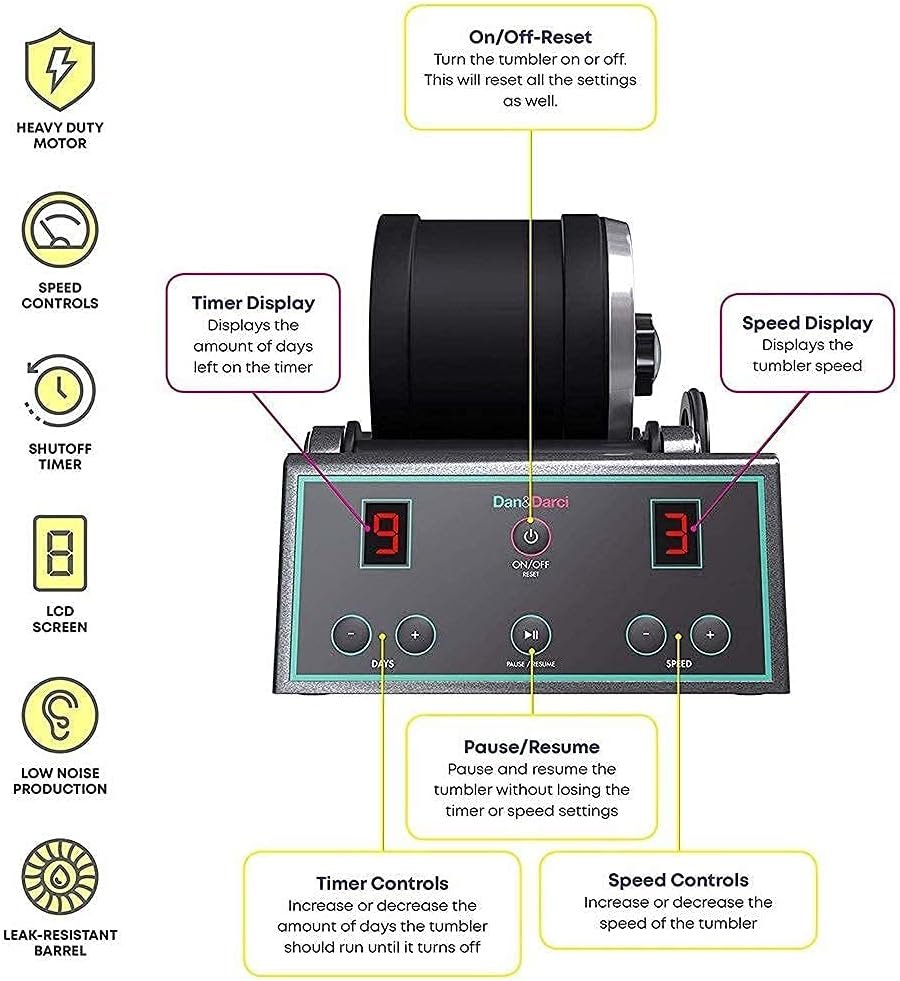 Advanced features: Includes speed controls (providing more granular tumbling results), a 9-day timer (shuts off automatically when you desire), all displayed on beautiful LCD screens.