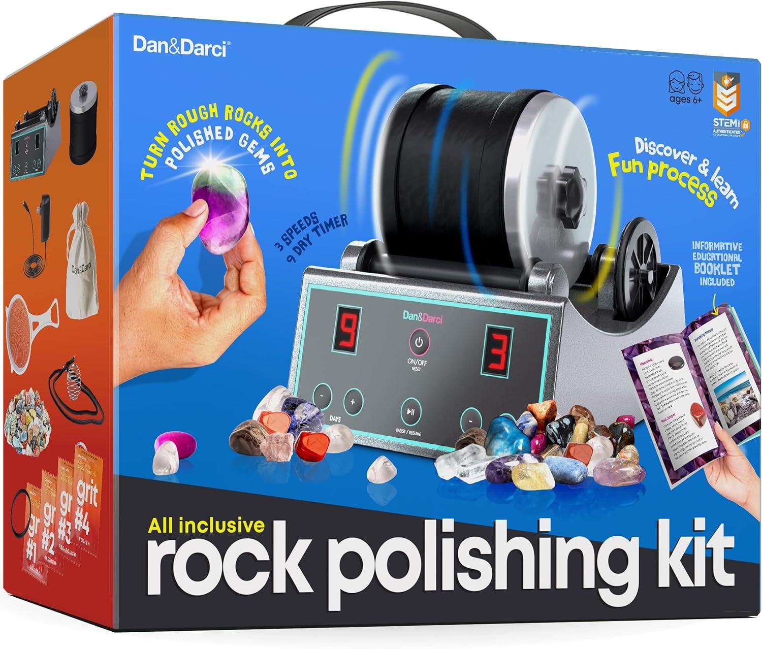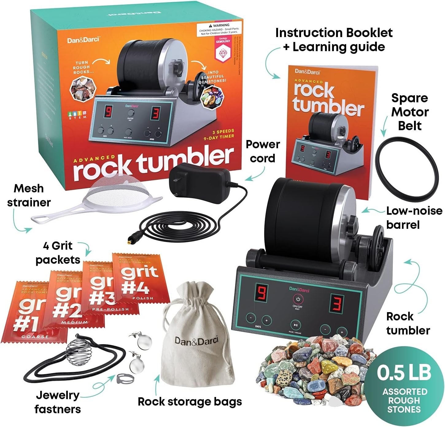 Complete kit: Includes: rock tumbler machine, low-noise barrel (1 lb. capacity), 4 grit packets, 1/2 lb. assorted rough rocks, mesh strainer, jewelry fasteners, gem storage bag, and an illustrated easy-to-follow instruction and learning guide booklet.