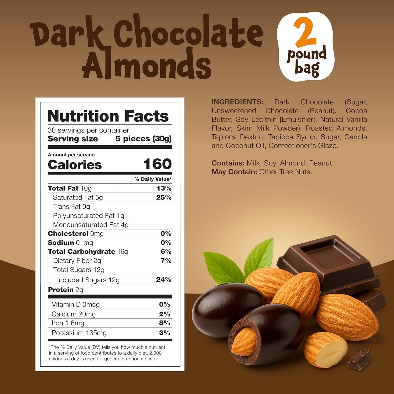 Our 2 pound pack of Dark Chocolate Covered Almonds turns any moment into a mini tasting bar; pour into jars for desk-side nibbling, build movie-night snack flights, or portion into favor bags
