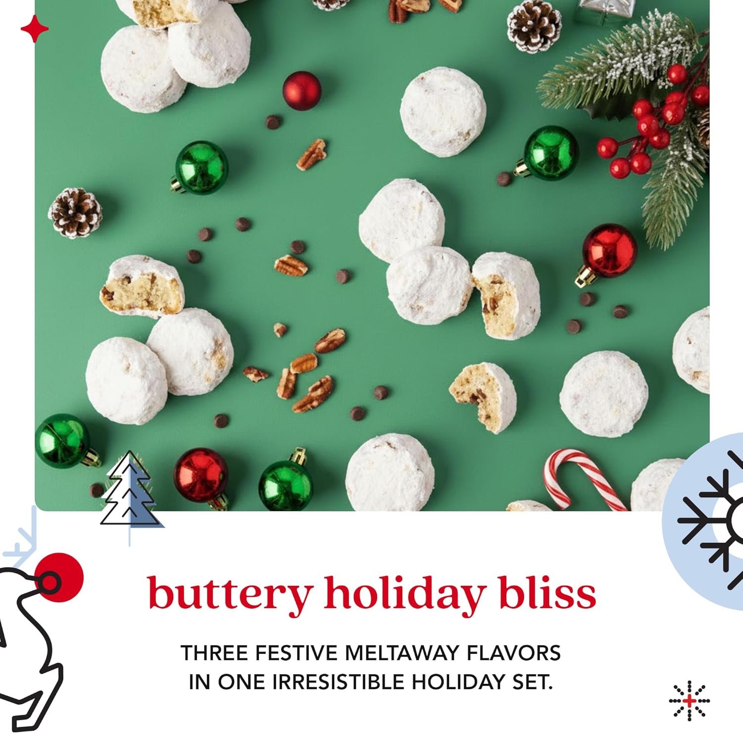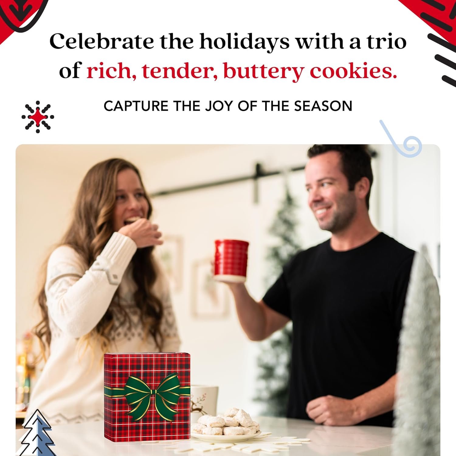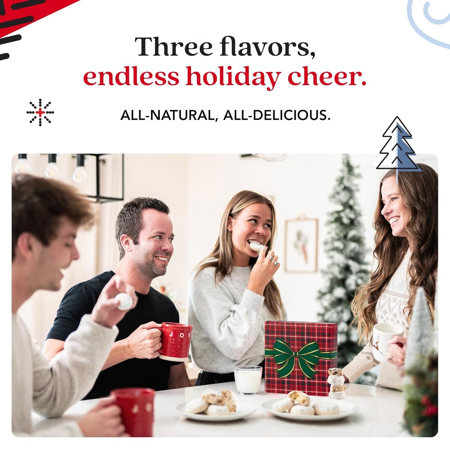 Three Irresistible Cookie Flavors Enjoy a festive variety of soft, melt-in-your-mouth cookies: Cinnamon, Chocolate Chip Pecan, and Butter Pecan, delivering a rich, indulgent flavor for every holiday craving.