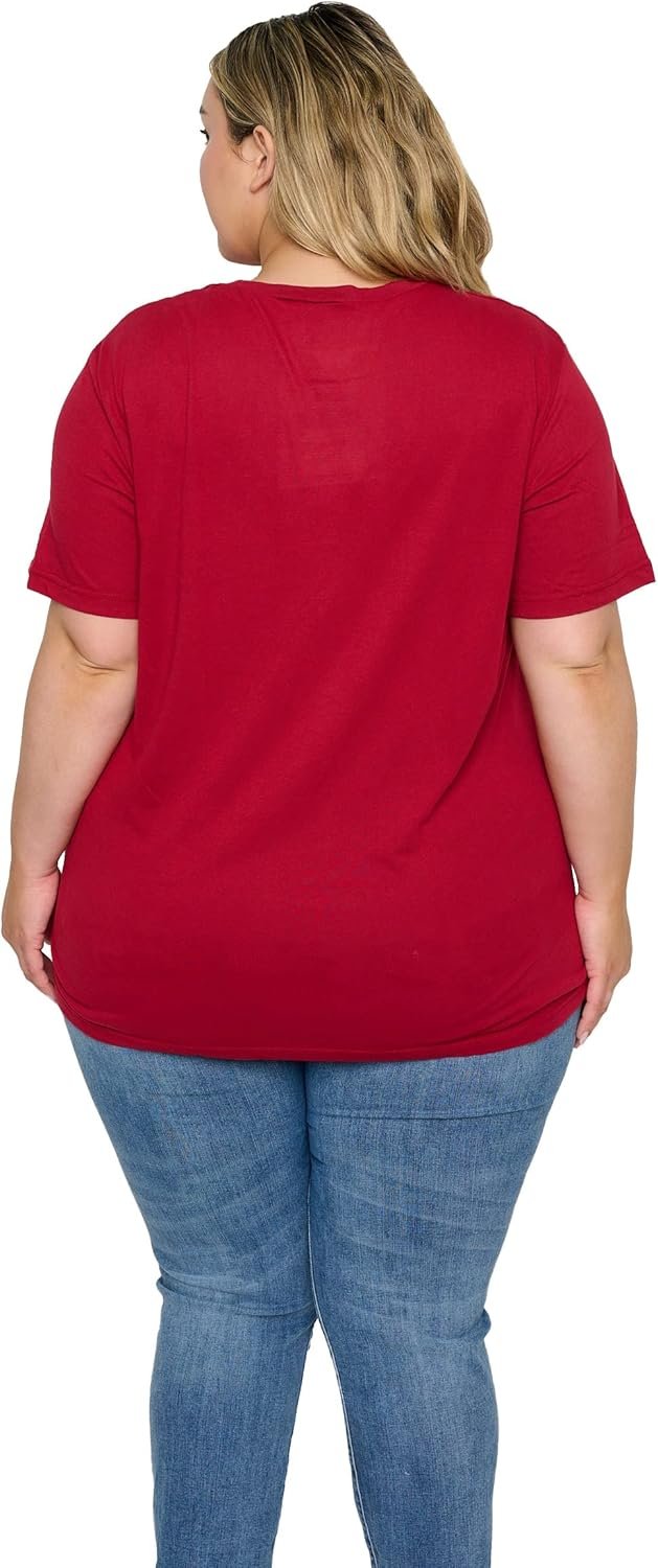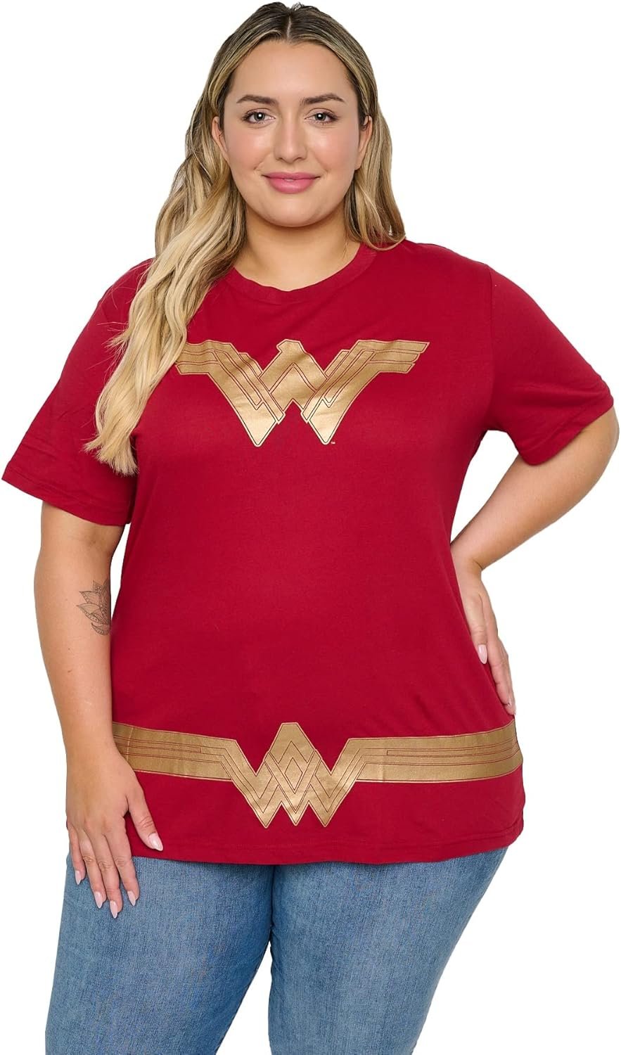 DC Comics plus size t-shirt with Wonder Woman logo print. The shirt has short sleeves, a crew neck and a straight cut for a unisex/boyfriend style (not fitted). Machine wash cold with like colors, tumble dry low. It is 100% cotton.