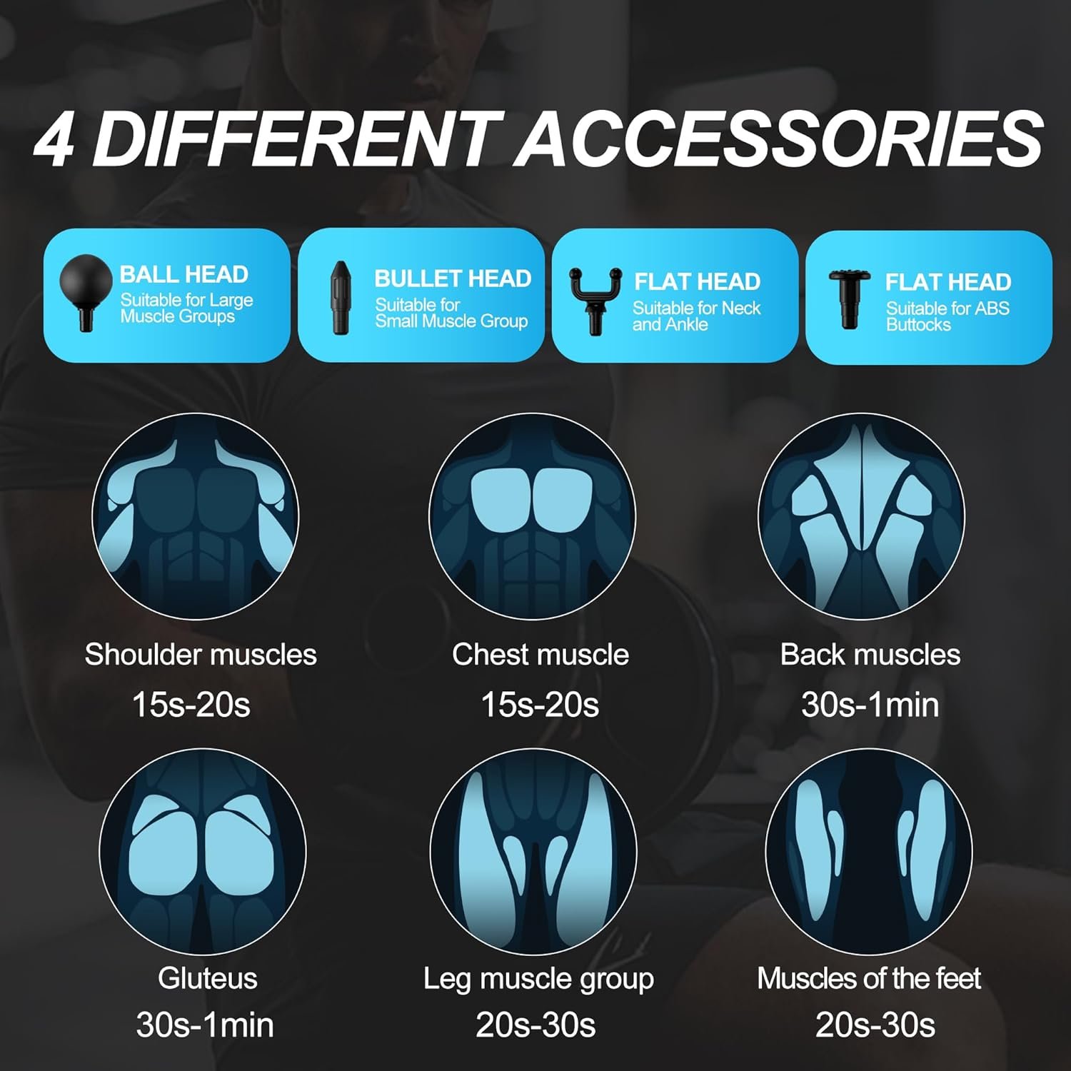 It is recommended to use each part for 15-60 seconds. The massage gun has a 15-minute automatic pause protection function to extend the life of the motor and battery.