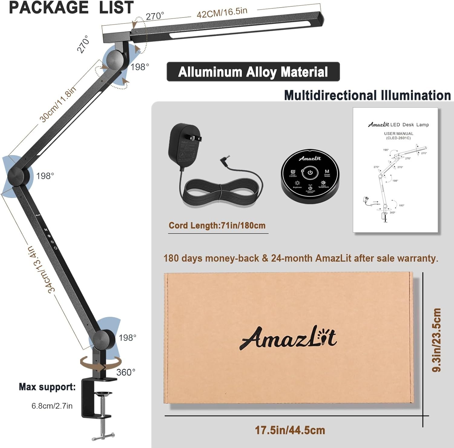 What you get: 1 x LED Desk Lamp 1 x Remote Control 1 x User Manual 1 x UL Adapter (Cord length: 71in/180cm)