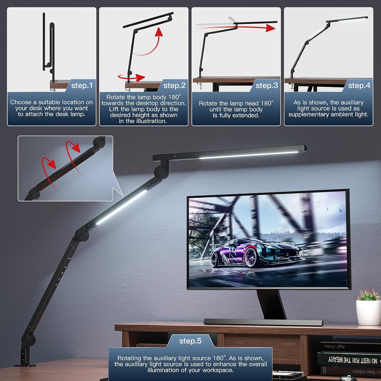❤ [Sturdy Metal Clamp, Flexible Long Swing Arm] — Extra wide metal clamp comes with silicone pads. Strong clamp supports up to 2.7in/ 6.8cm desktop and holds the swing arm lamp securely in place. Saving space and keeping your desktop clean. With versatile 6-axis design, freely adjustable angles and multiple positions, you can adjust the light direction according to your personal need