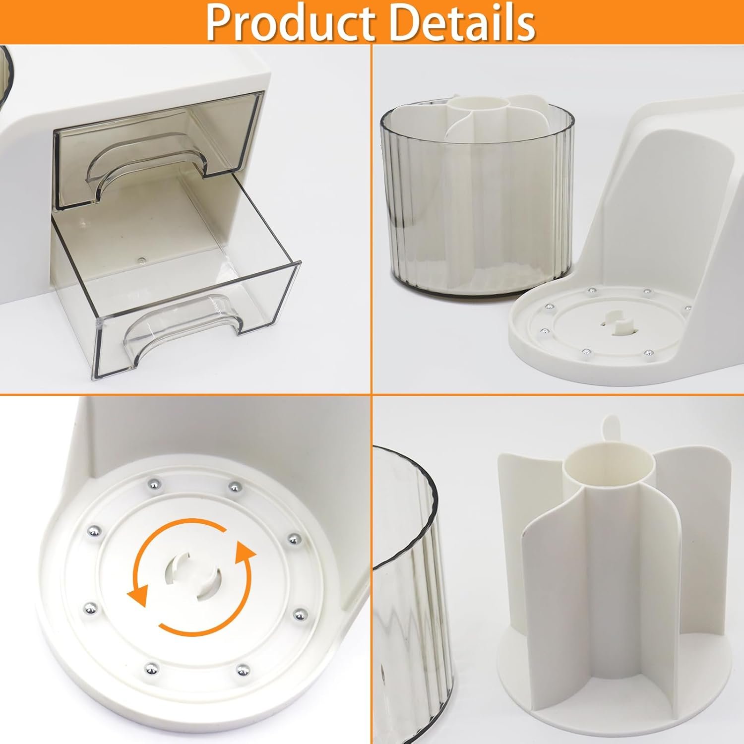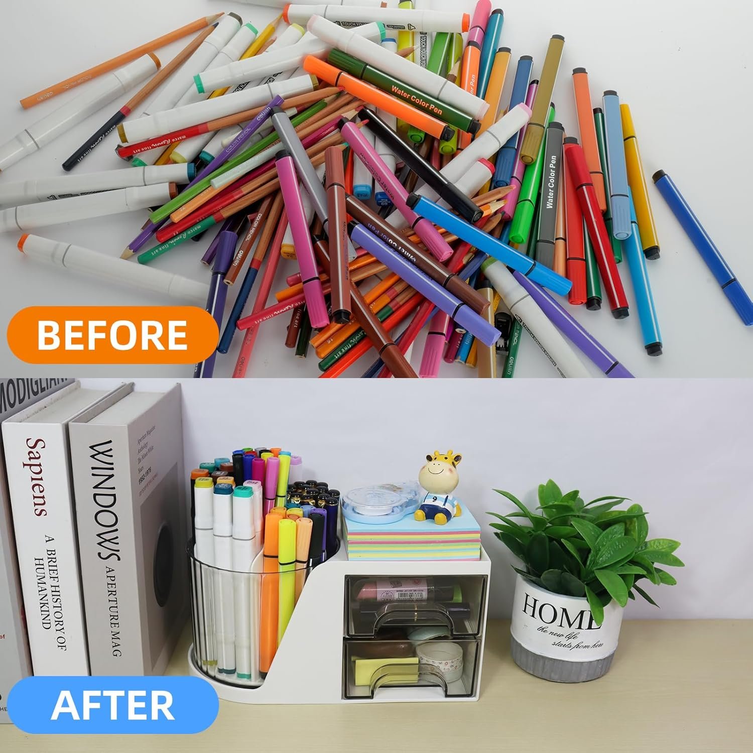 All-in-one Desk Organizer: This desk pencil organizer has three parts-a rotating pen holder + a top platform + 2 little drawers. No assembly required. Effortlessly organize your desk with flytreal 360-degree rotating desktop organizer. It holds a variety of items, such as pens, markers, colored pencils, paint brushes, erasers, and more.
