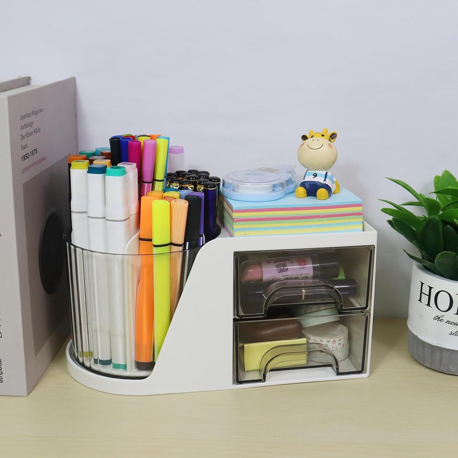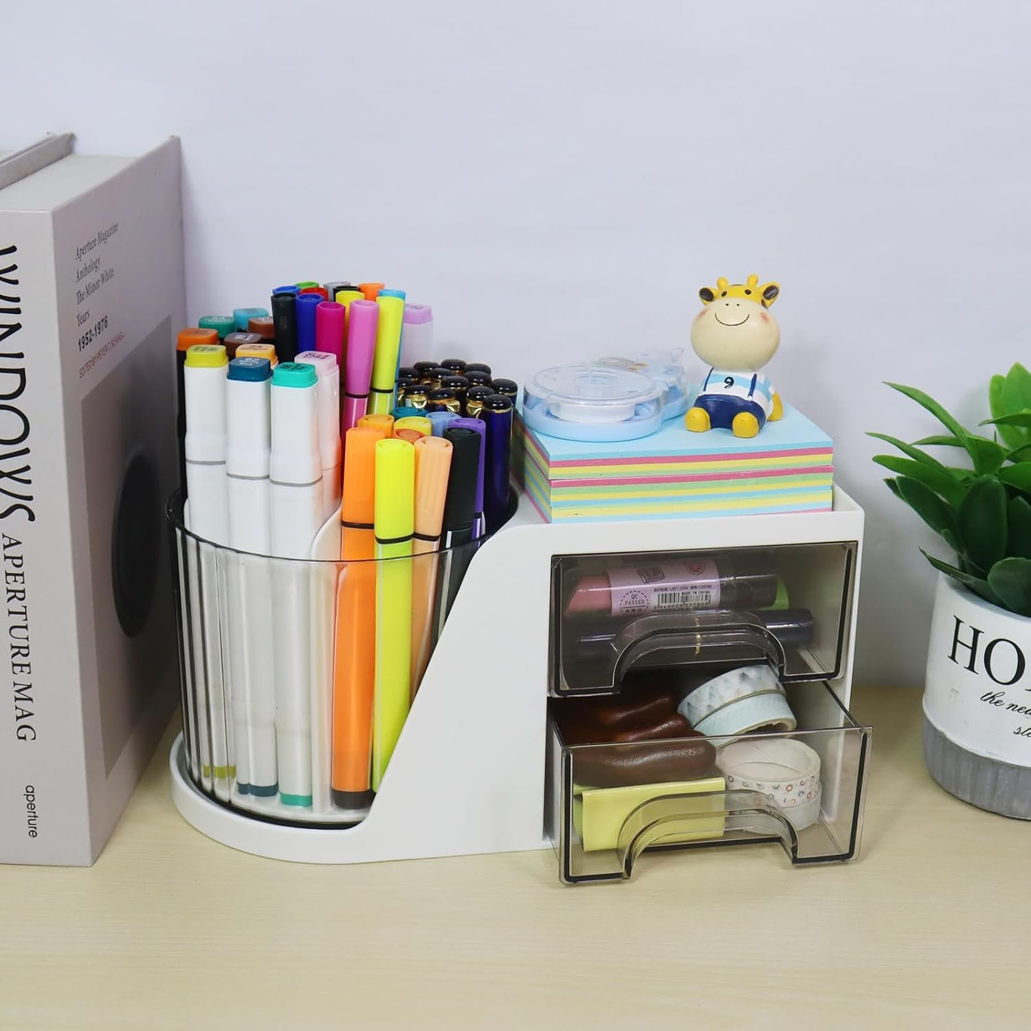 The desk pen holder rotates smoothly for easy access to each of the 6 sections. The two drawers are good for small stuff, such as paperclips, erasers or whatever you need to store. The top platform is suitable for sticky note or small notebook. Keep your desk tidy.