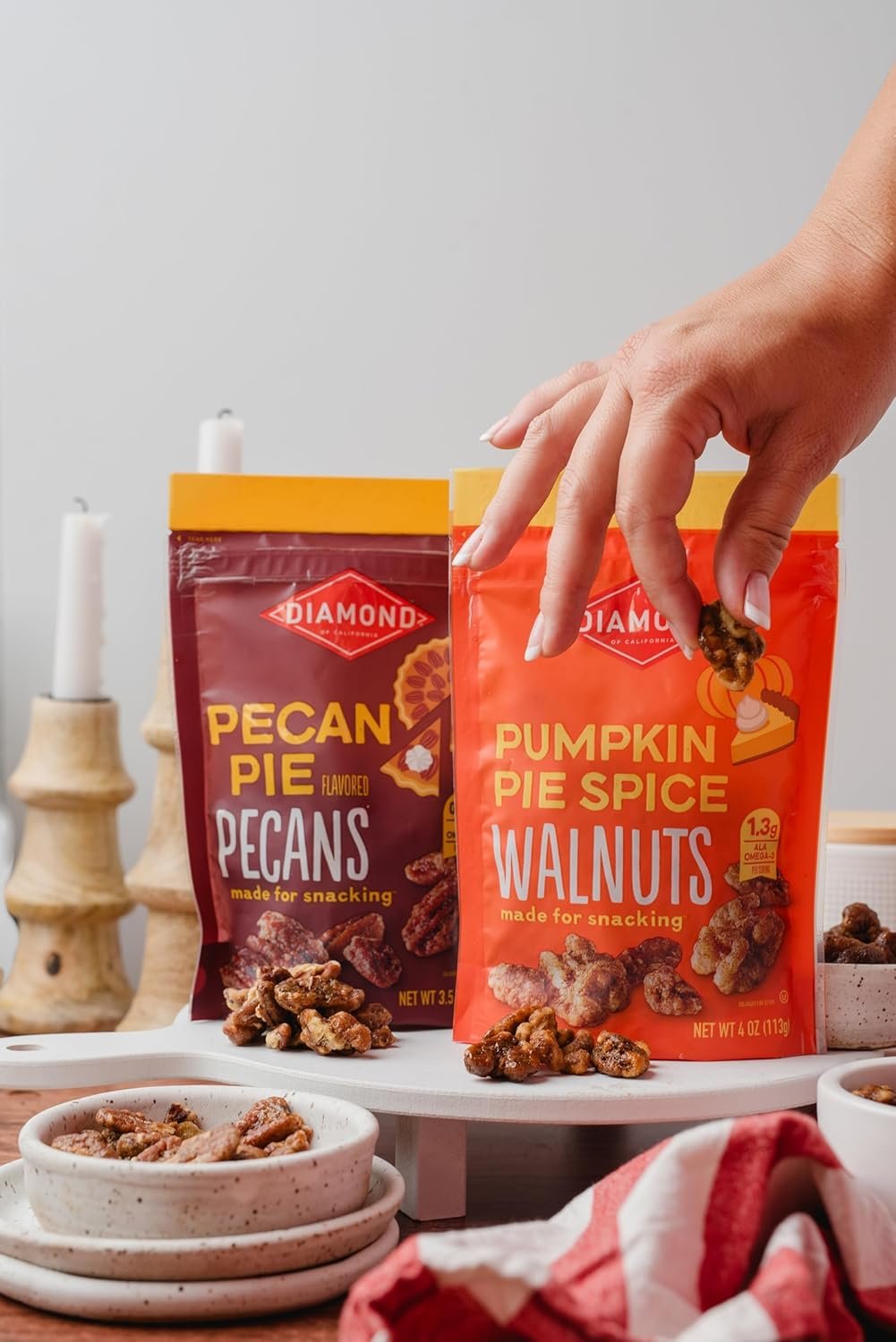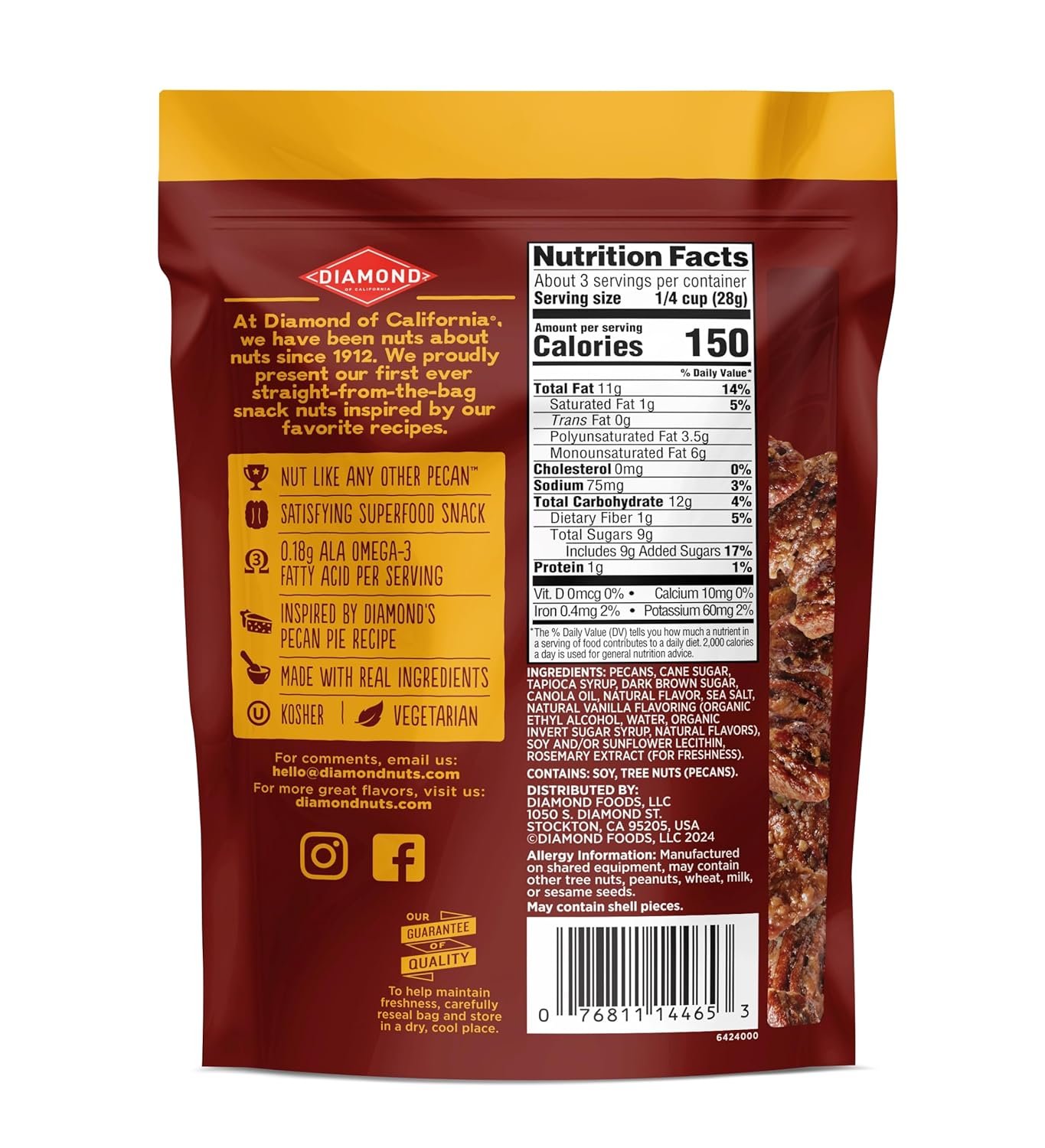Diamond pecans are known for their earthy, nutty flavor. At Diamond of California, we offer fresh, high-quality, and great-tasting nuts for every occasion, whether preparing the perfect salad mix, snack mix, or a sweet dessert. From whole or chopped to sliced or slivered, we offer a wide range of chop types and varieties of nuts both in and out of their shells — all to help you prepare delicious, balanced, and heart-healthy meals as quickly and as easily as possible. This includes shelled and in-shell walnuts, pecans, almonds, nut pie crusts, black walnuts, macadamias, pine nuts, hazelnuts, roasted/glazed nut toppings, nut + fruit blends.