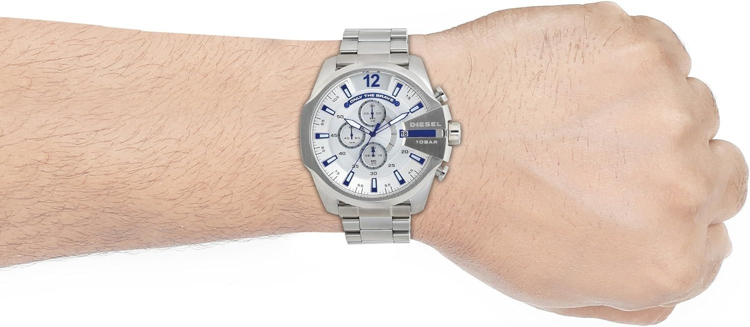 The Diesel Men’s Mega Chief is a water-resistant item, rated 3.5, designed for underwater activities. It’s available in Black, priced at $172.99, and can withstand water resistance up to 10 ATM, equivalent to 330 feet.