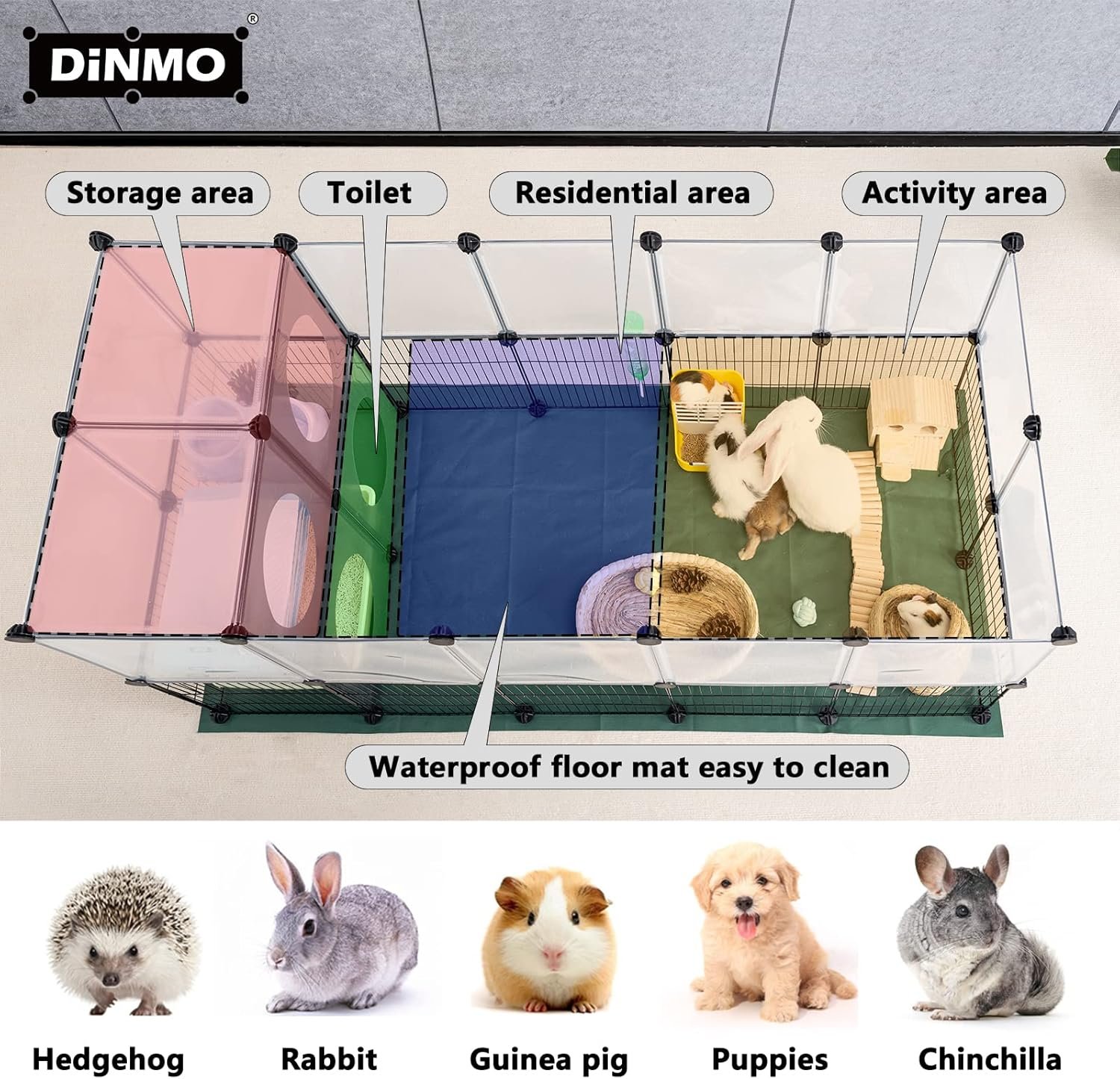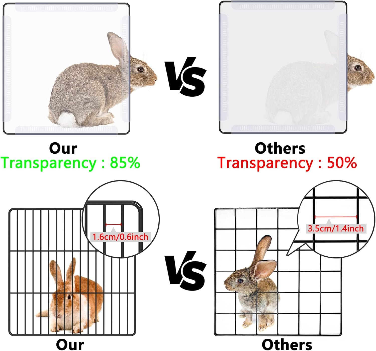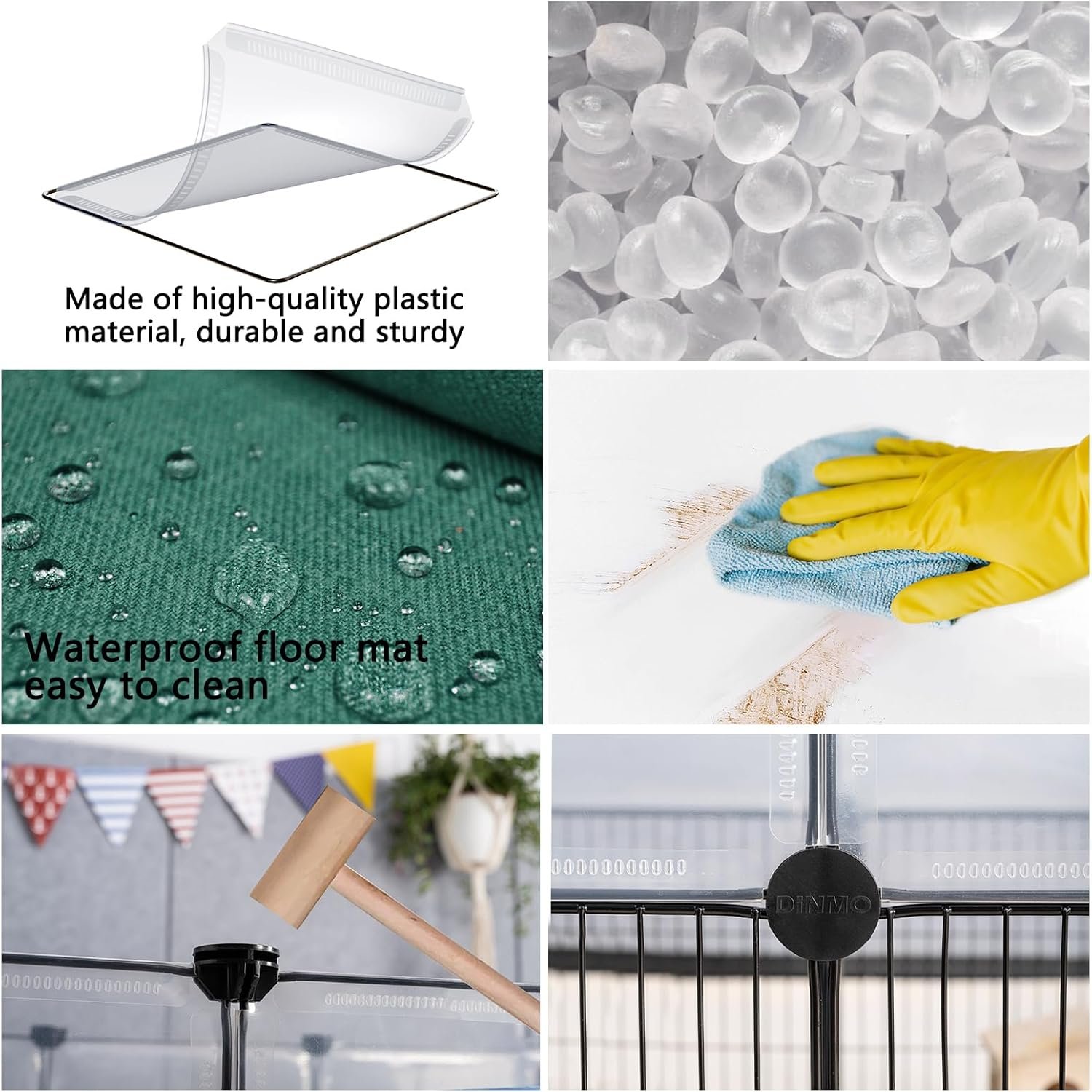 Iron-Plastic Combination, Visualization: Clear plastic panels and iron mesh panels maintain sufficient visualization, you can see and interact with your rabbits, guinea pigs, hedgehogs, puppies, hamsters, ferrets, turtles, etc. at any time; Plastic panel of pet playpen is easy to clean and beautiful; the iron mesh panel is located on the lower layer, which is ventilated and prevents pets from chewing.