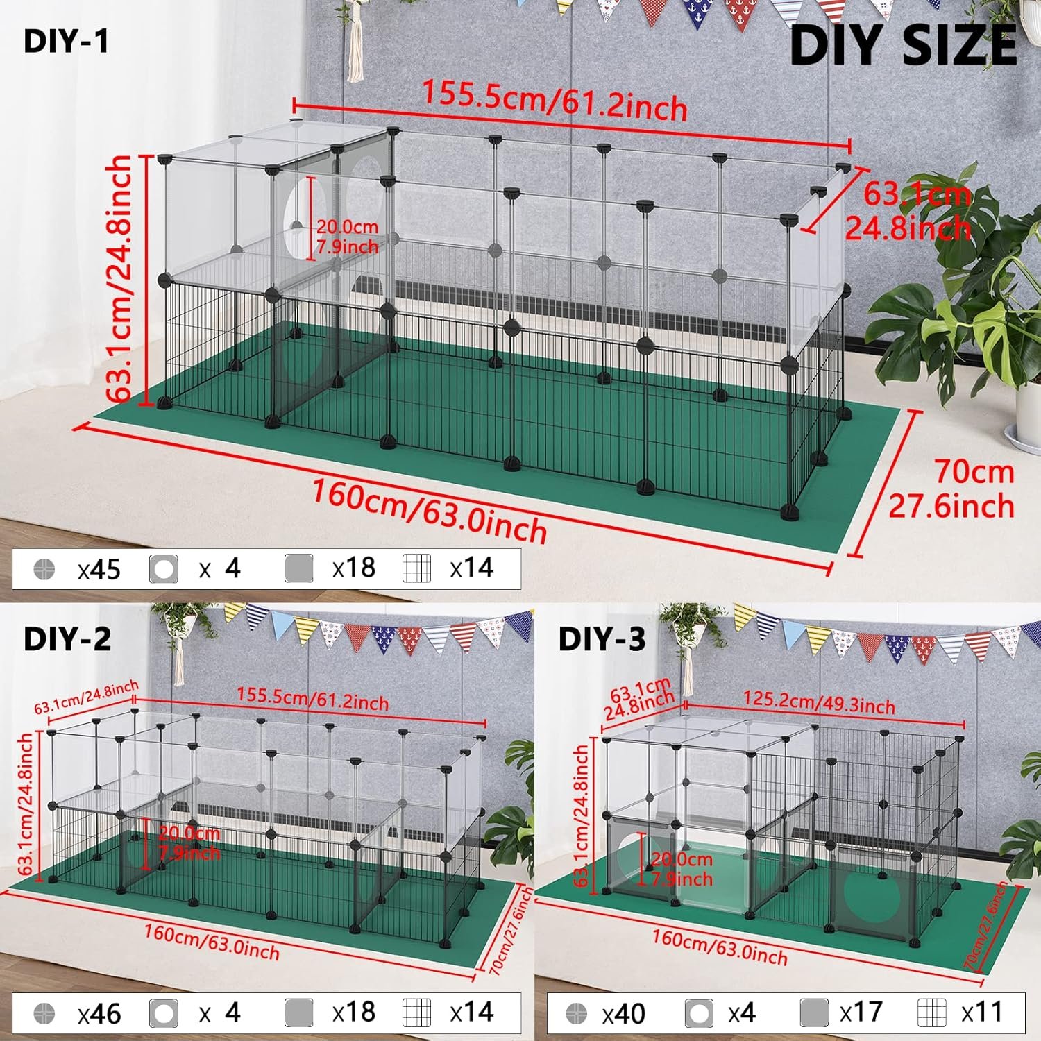 Oxford Cloth Floor Mats, Non-slip Pads: This rabbit fence also provides green oxford cloth mats, which can prevent the floor from being scratched, corroded by urine, non-slip, easy to clean, and give pets the feeling of being in nature; non-slip gaskets stick to At the bottom of the buckle, the friction with the ground or floor mat can be increased to further protect the floor or floor mat and prevent sliding.
