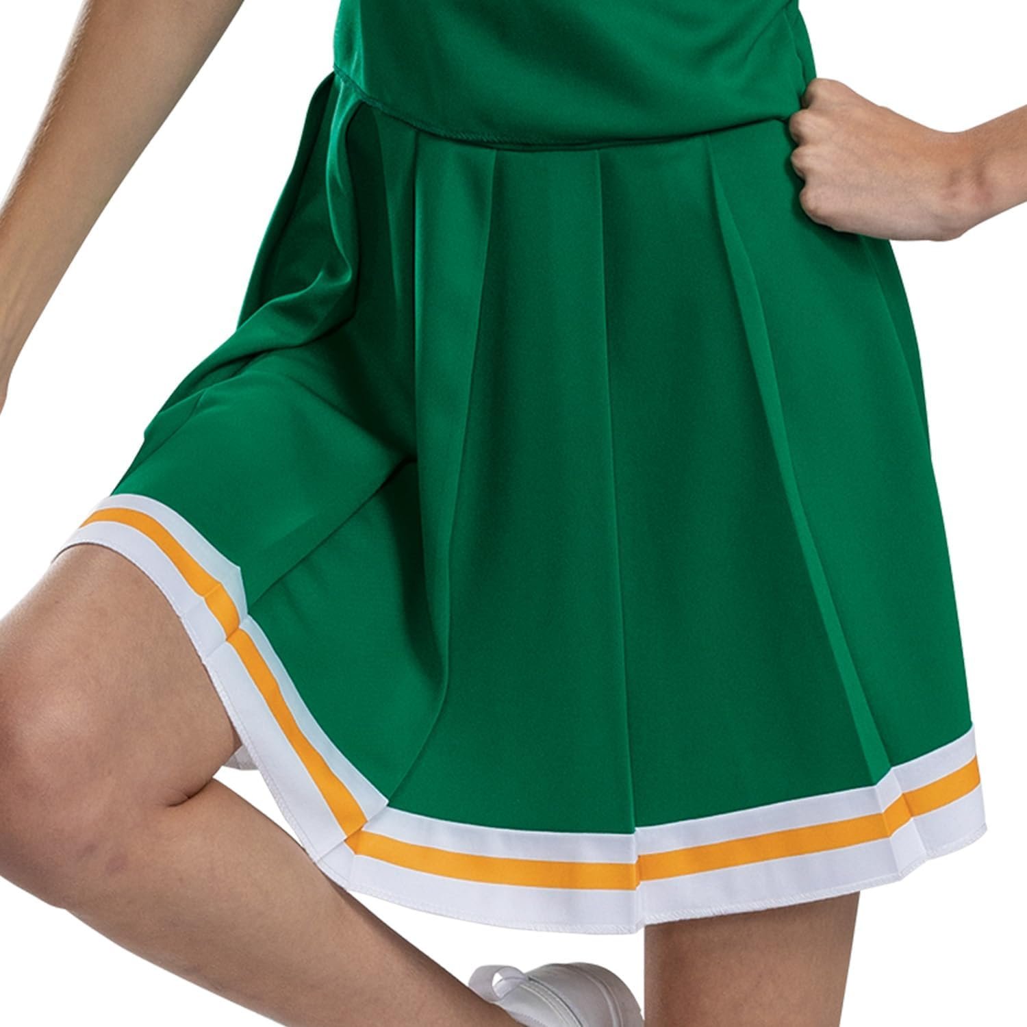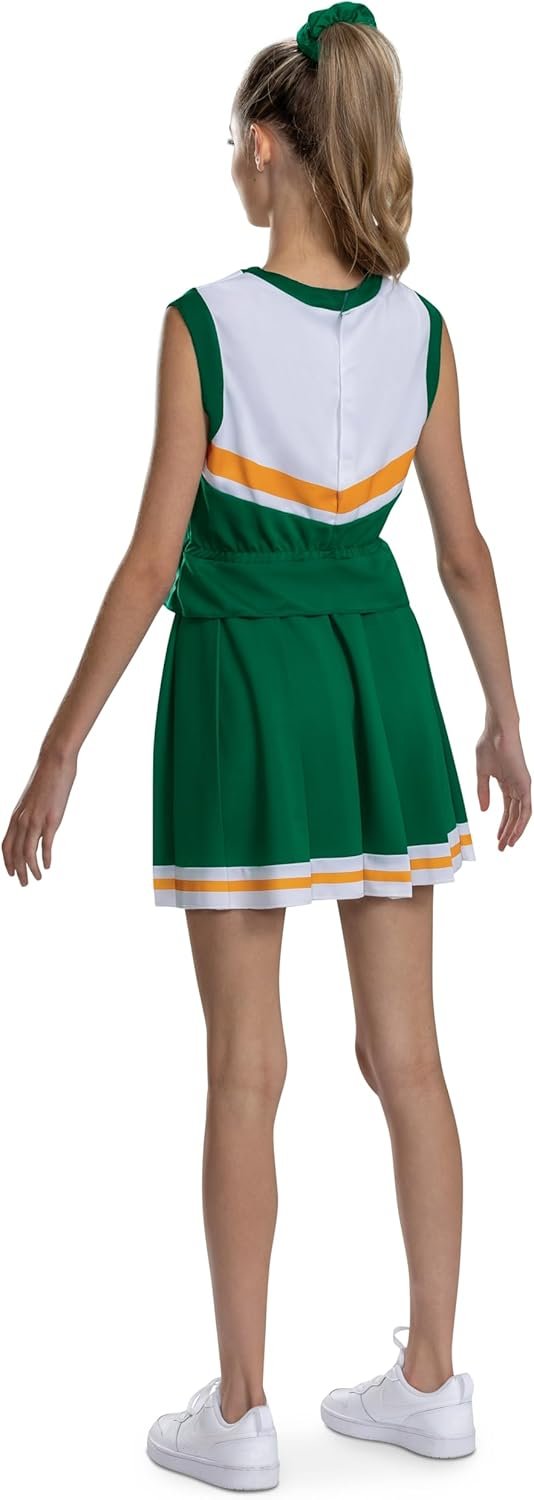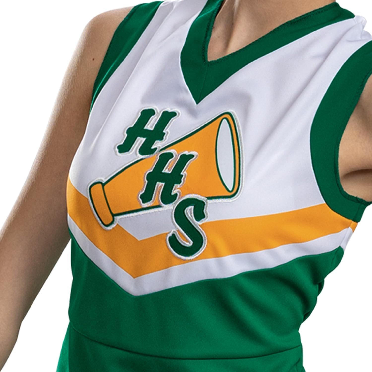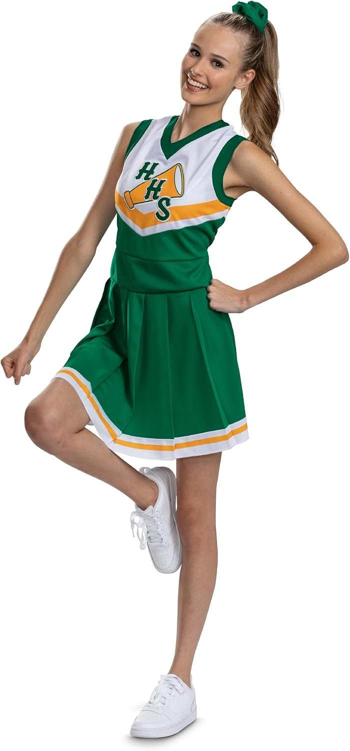 Now you can cheer for Hawkins High School and wear this Hawkins Season 4 Tigers Cheerleader tween classic costume! This costume features a v -neck top with sublimated Hawkins High school logo on the front and a yellow chevron line detail. A pleated skirt with the same yellow stripe detail is also included to complete the full cheerleader look! Socks not included.