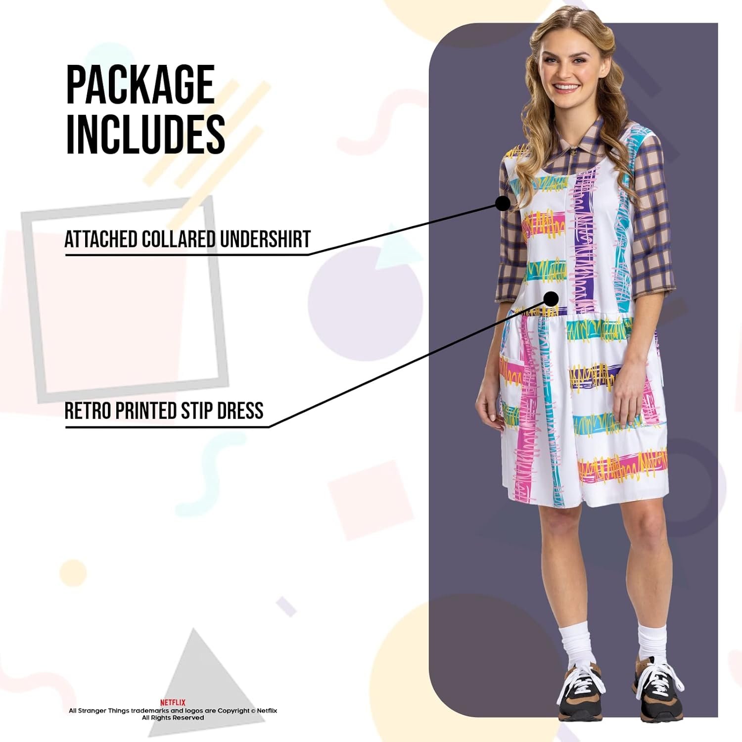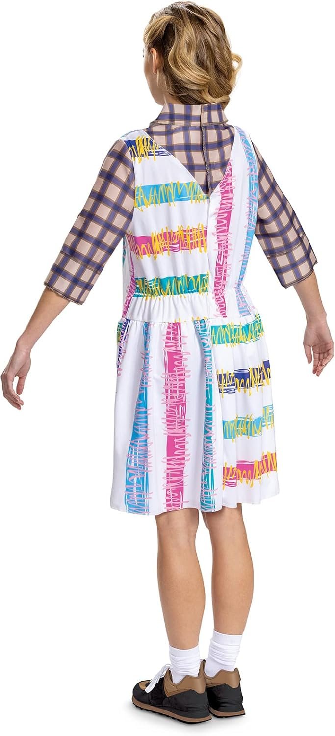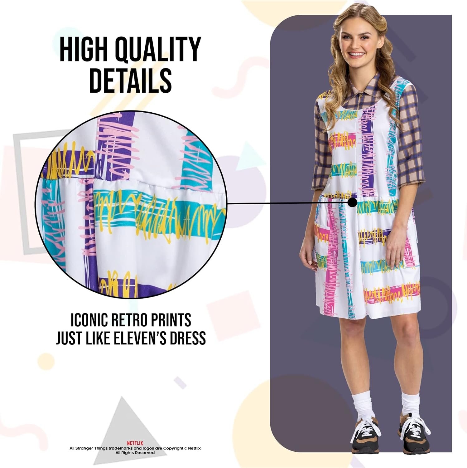 You can become Eleven and get ready for your date in this Eleven Season 4 Look Deluxe Adult costume! This costume features a sublimated striped art dress with panel detailing, and an attached plaid collared undershirt. Socks not included.