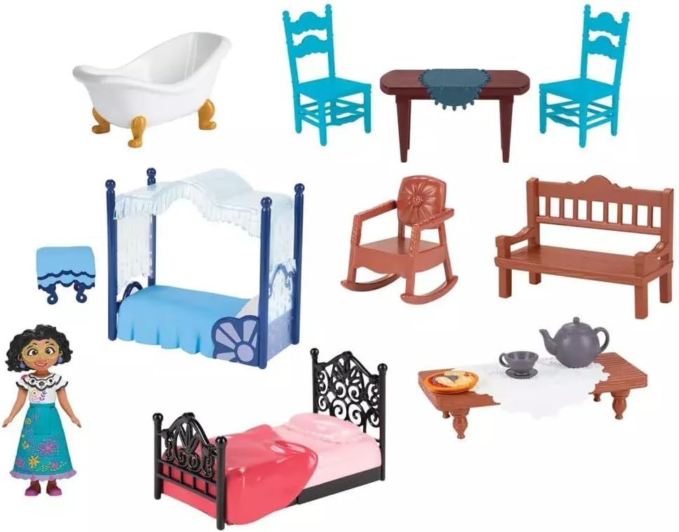 Includes: 1 Magical Casa Madrigal, 1 Mirabel Doll, 1 Staircase, 1 Food Piece, 1 Tea Cup Saucer, 1 Tea Cup, 1 Tea Pot, 1 Rocking Chair, 1 Outdoor Table, 1 Bench, 1 Dinging Table, 2 Dining Chairs, 1 Bath Tub, 1 Mirabel Bed, 1 Pepa Bed, 1 Foot Stool, 1 Label Sheet