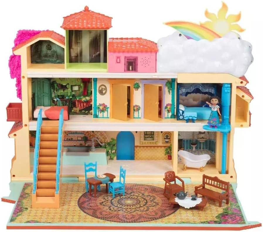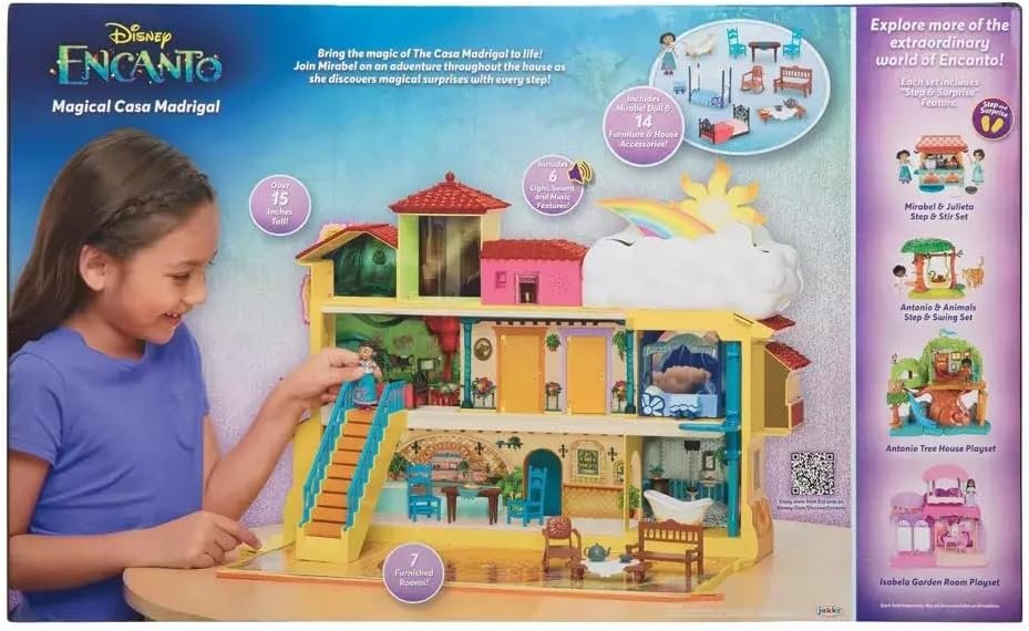 Walt Disney Animation Studio’s 60th feature, Encanto, tells the tale of an extraordinary family, the Madrigals, who live hidden in the mountains of Colombia, in a magical house, in a vibrant town, in a wondrous, charmed place called an ‘Encanto’. The magic of the Encanto has blessed every child in the family with a unique gift from super strength to the power to heal—every child except one, Mirabel. But when she discovers that the magic surrounding the Encanto is in danger, Mirabel decides that she, the only ordinary Madrigal, might just be her exceptional family’s last hope.Journey into the Magical Casa Madrigal from Disney’s Encanto, and bring the magical gifts of the Madrigal family to life! Designed to be just like the vast and extraordinary Casita, this playset includes lights, sounds, and movement features, and stands over 15 inches tall, unfolding to reveal 3 floors with 7 furnished rooms! Step and Surprise! When the included Mirabel doll is placed in her unique footprint area, a lively music and light celebration plays throughout the entire Casa Madrigal! Just like in the movie, play out changing the weather like Aunt Pepa with the feature elevator! Lift the elevator to see a sunshine and rainbow appear above the clouds and reveal colorful lights and the sounds of birds chirping. Lower the elevator, and the sunshine and rainbow disappear, triggering thunderstorm sounds, and lighting-like flickering lights. The enchanted Casita loves to play with Mirabel! Place the Mirabel doll on the staircase, and it transforms into a surprise slide that she glides down! So much fun! Visit Mirabel’s charming bedroom for more magical surprises. Place Mirabel on the button on the floor of her room to hear her sing music and see lights! Upstairs, there are Mirabel’s sister, Isabela, and cousin, Antonio’s magical doors to discover! Open these golden doors, that look just like their doors in the film, to reveal lights and sounds coming from Isabela’s garden and Antonio’s rainforest.Decorate the Magical Casa Madrigal with 15 house accessories, including beds, tables, and chairs, and play out your favorite story scenes with the included Mirabel doll. The Magical Casa Madrigal also includes Uncle Bruno’s mysterious tower, Julieta’s kitchen, a grand courtyard, and a bathroom. With the Magical Casa Madrigal, you’ll have hours of fun playing out your favorite movie moments from Disney’s Encanto!