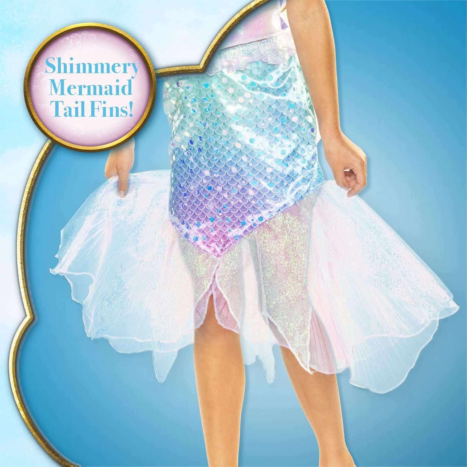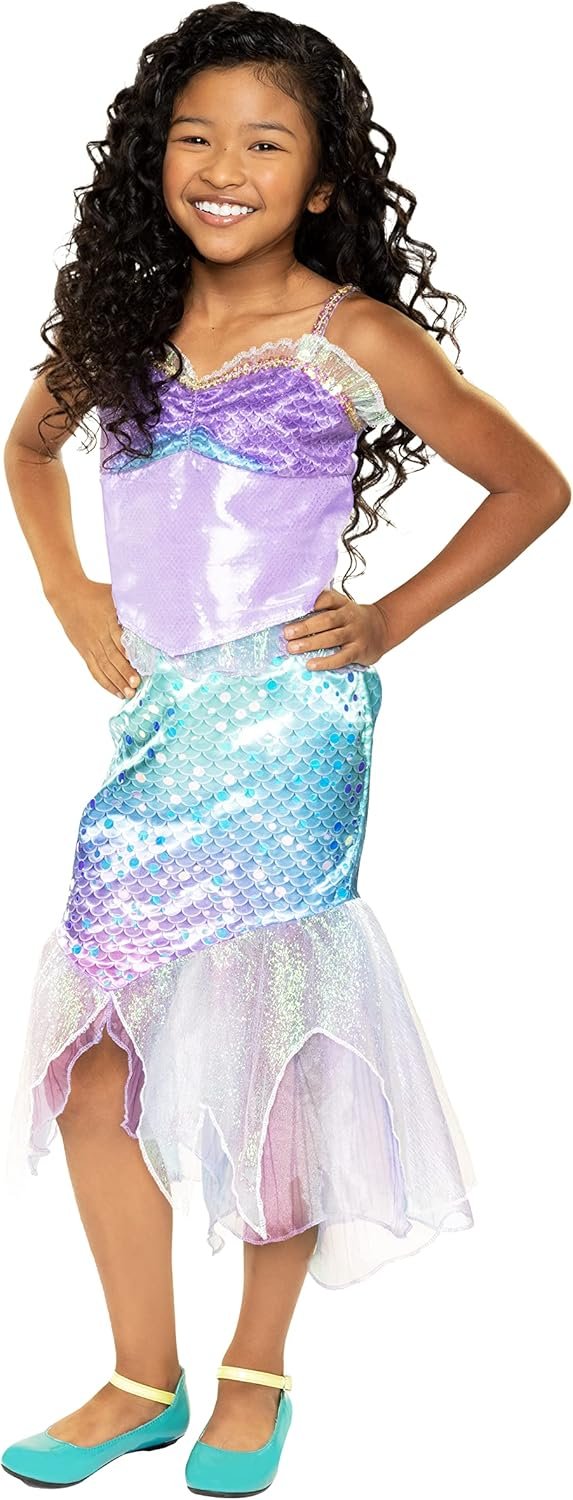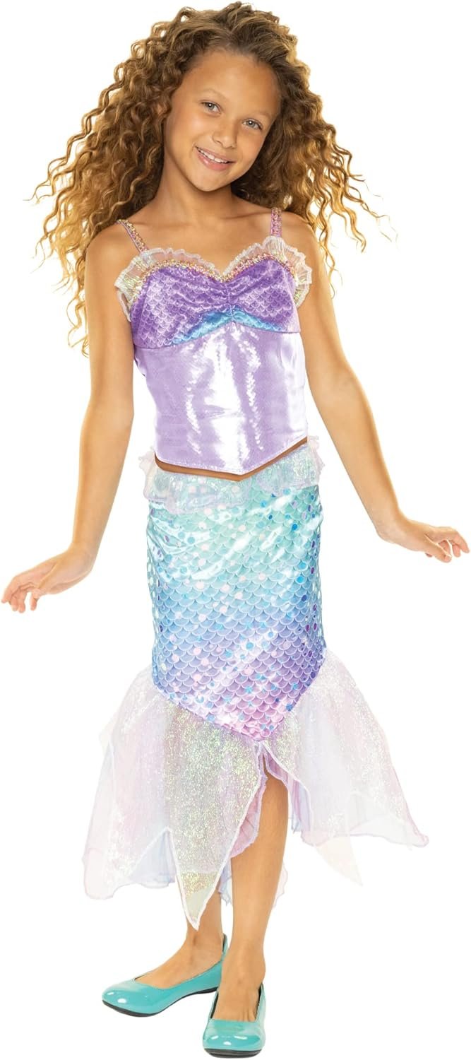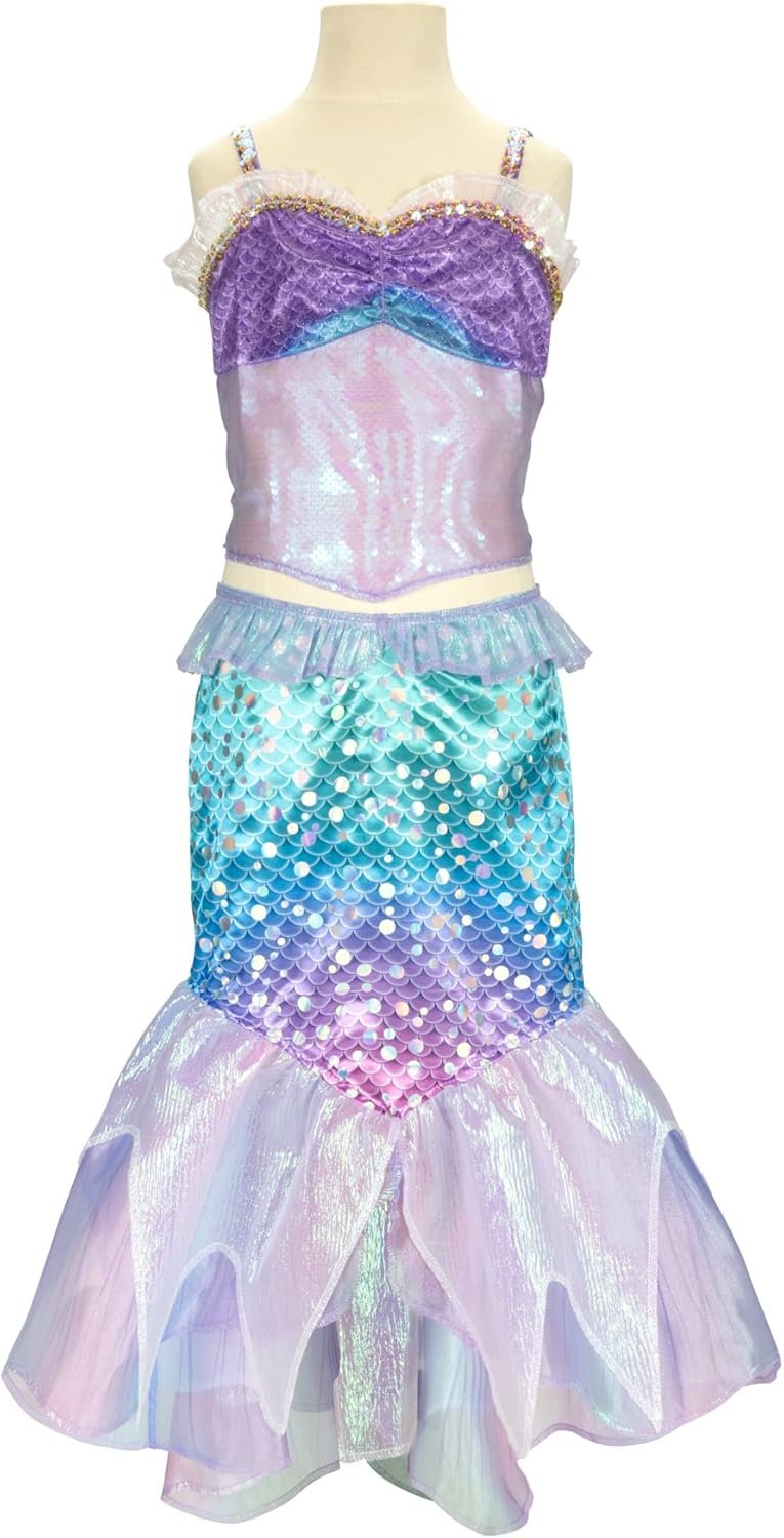 Relive Ariel’s magical adventure from Disney’s The Little Mermaid with Ariel’s 2 Piece Mermaid Fashion! With this beautiful Ariel fashion, you can dress up just like your favorite mermaid and pretend to go on under-the-sea adventures of your own! This 2-piece top and skirt is inspired by her signature under-the-sea look from the film, and features deluxe design details, and premium shimmery fabrics. Ariel’s gorgeous mermaid top includes an iridescent ruffled neckline and glittery tulle fabric overlaying the scale print design. Shimmery iridescent fabric pieces flow from the end of the skirt, just like Ariel’s fabulous mermaid tail fins!