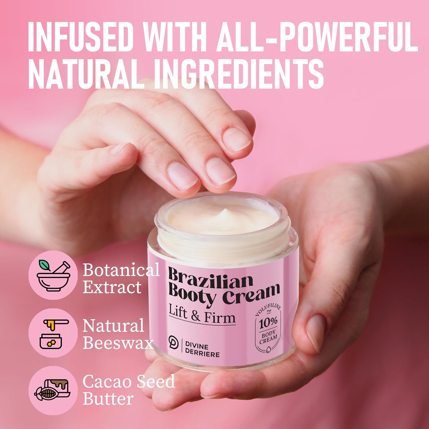 Proven Effective & Safe – A 56-day trial with 28 participants found that Volufiline, the main ingredient in the Divine Derriere Brazilian Booty Cream helped to smooth and tighten the look of your skin for a sleeker, lifted appearance.