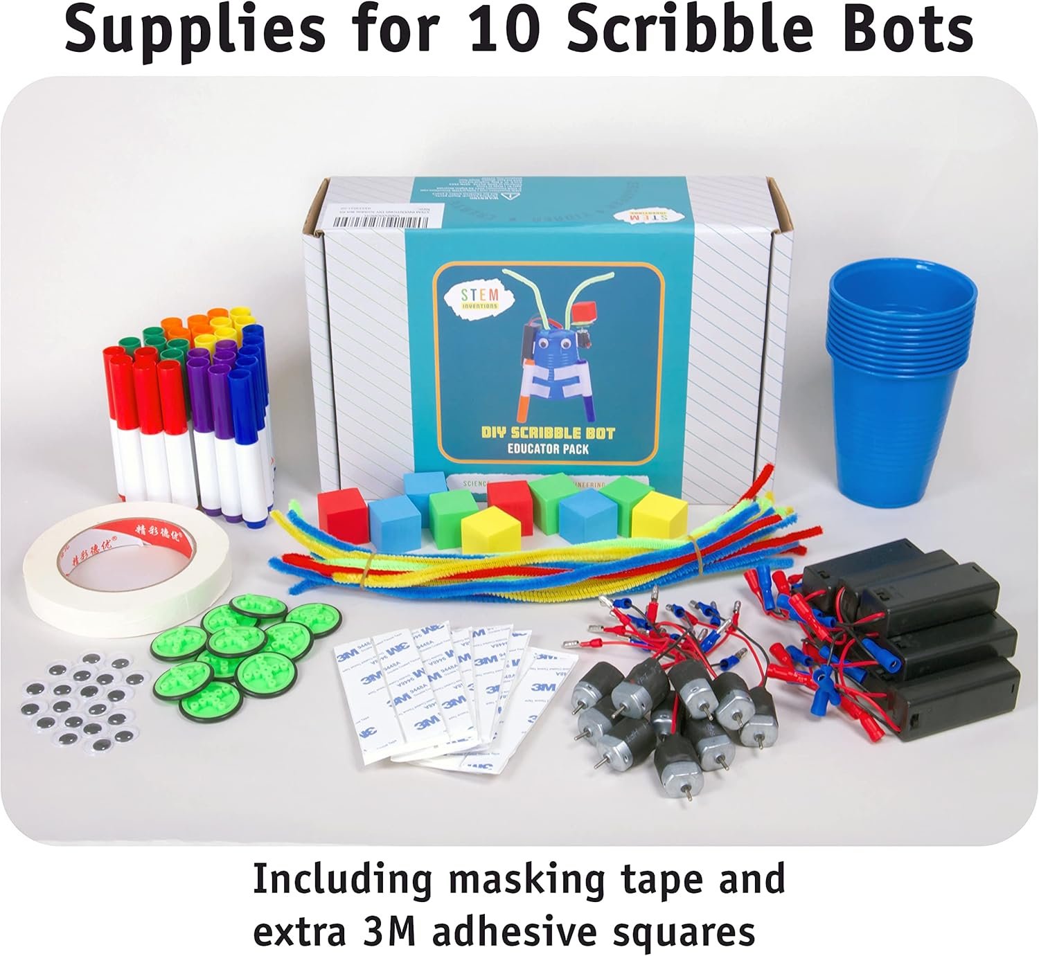 Complete DIY Kit: Each set includes all the supplies needed to build 10 motorized doodling, scribbling, drawing bots for kids in elementary and middle school.