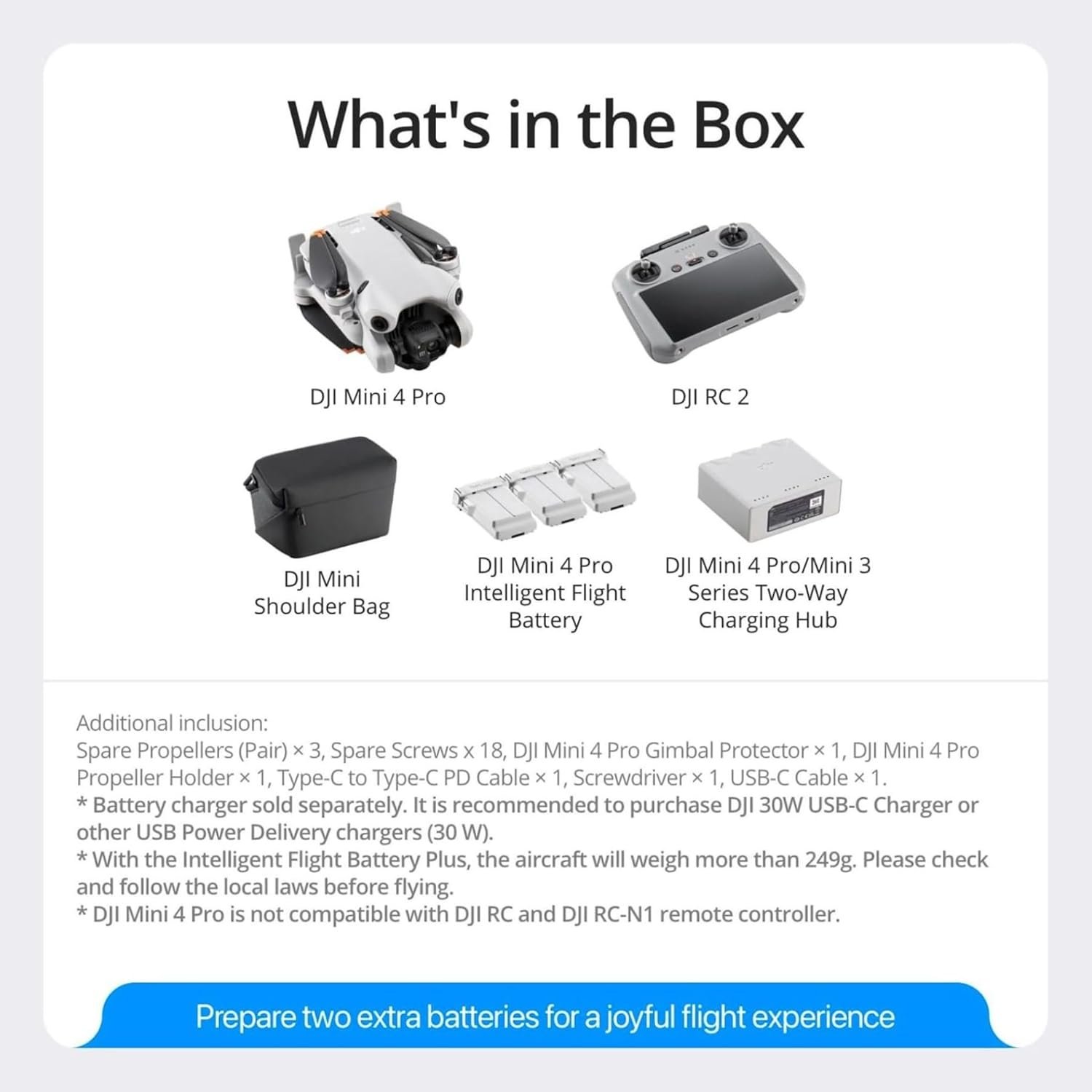 -DJI Mini 4 Pro Fly More Combo (DJI RC 2) includes an RC 2, three Batteries, a Charging Hub, and more! Fast charge multiple batteries simultaneously & fly longer.