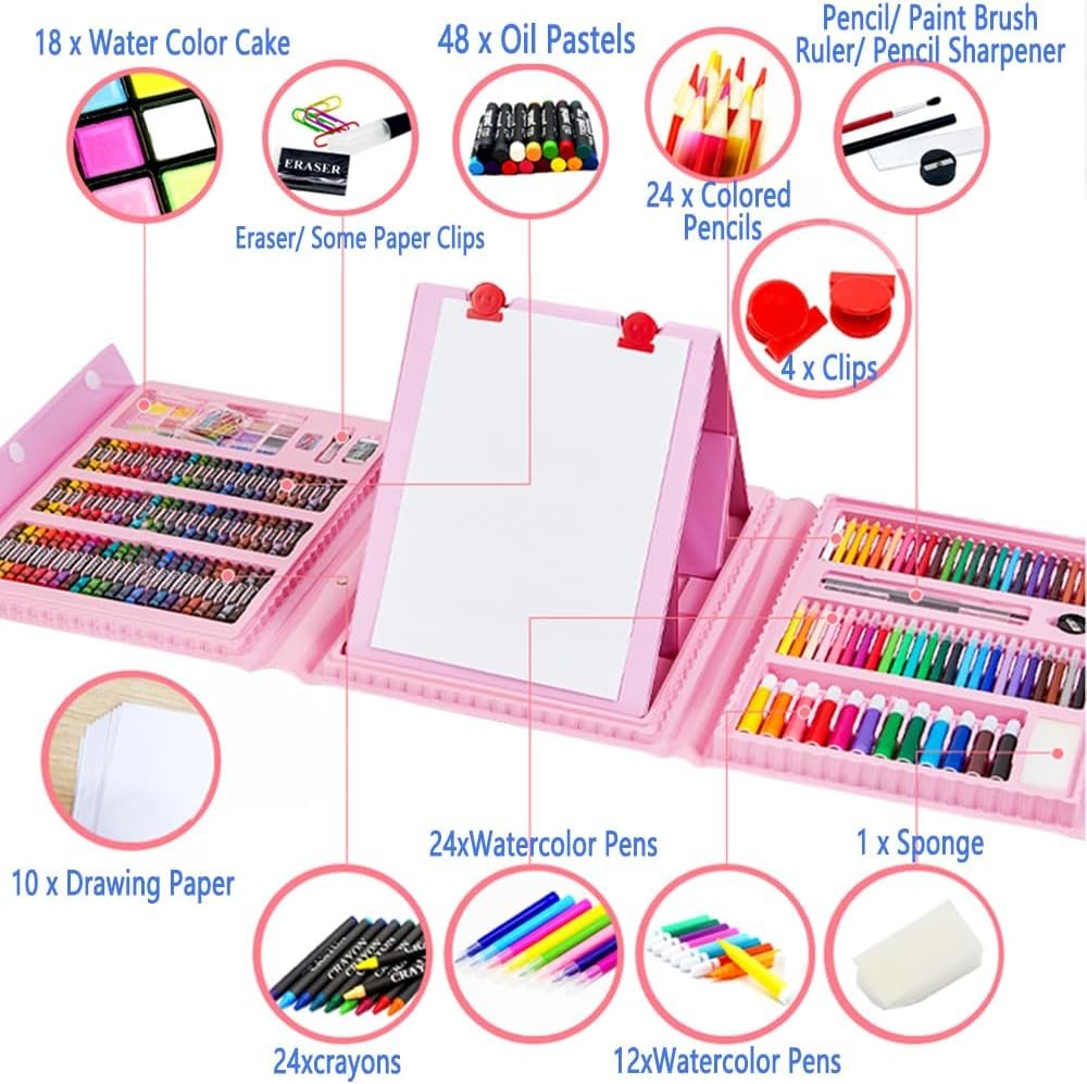 DLUCKY Art kits 208 PCS Drawing Art Set for Kids Adults with Double Sided Trifold Easel Art Supplies Oil Pastels, Crayons, Colored Pencils, Watercolor Pens for Girls Boys