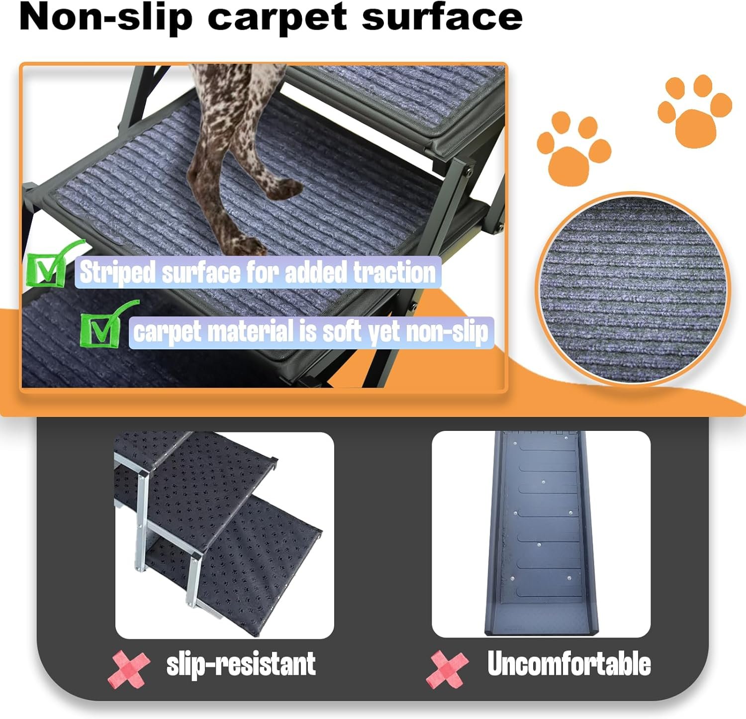 Anti-Slip Carpet Surface:Our dog stairs features a durable anti-slip rug surface that provides superior traction, even in wet conditions. The soft felt material offers comfort while reducing slipping risks, easing joint pressure, and ensuring stability for your pet as they climb or descend.