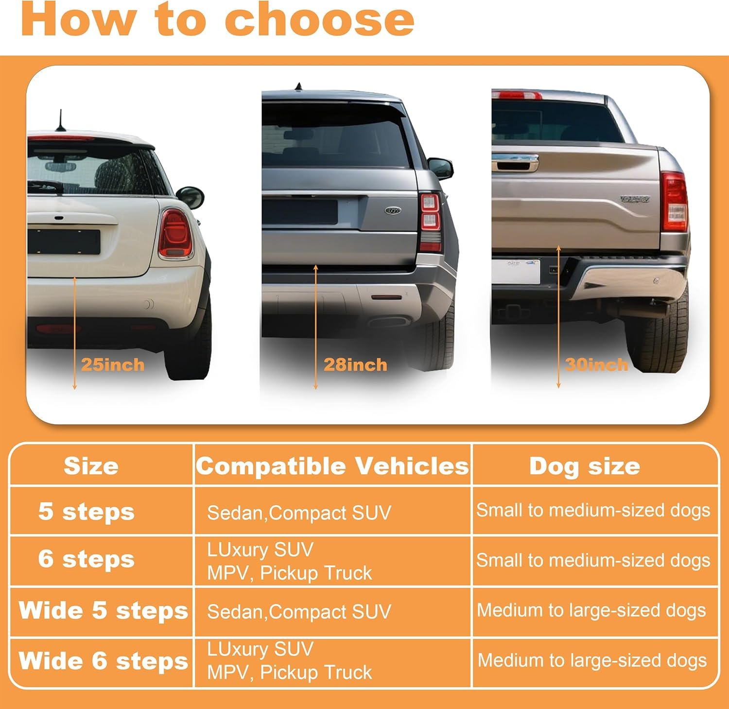 Generally, a 6-step ladder is suitable for pickup trucks and large SUV trunks, while wider versions are more appropriate for larger dogs. It is particularly important to note that if the ladder is intended for use at the rear door to assist your dog in getting in and out of the vehicle, ensure that the angle and width of the door when open are sufficient to accommodate the ladder.