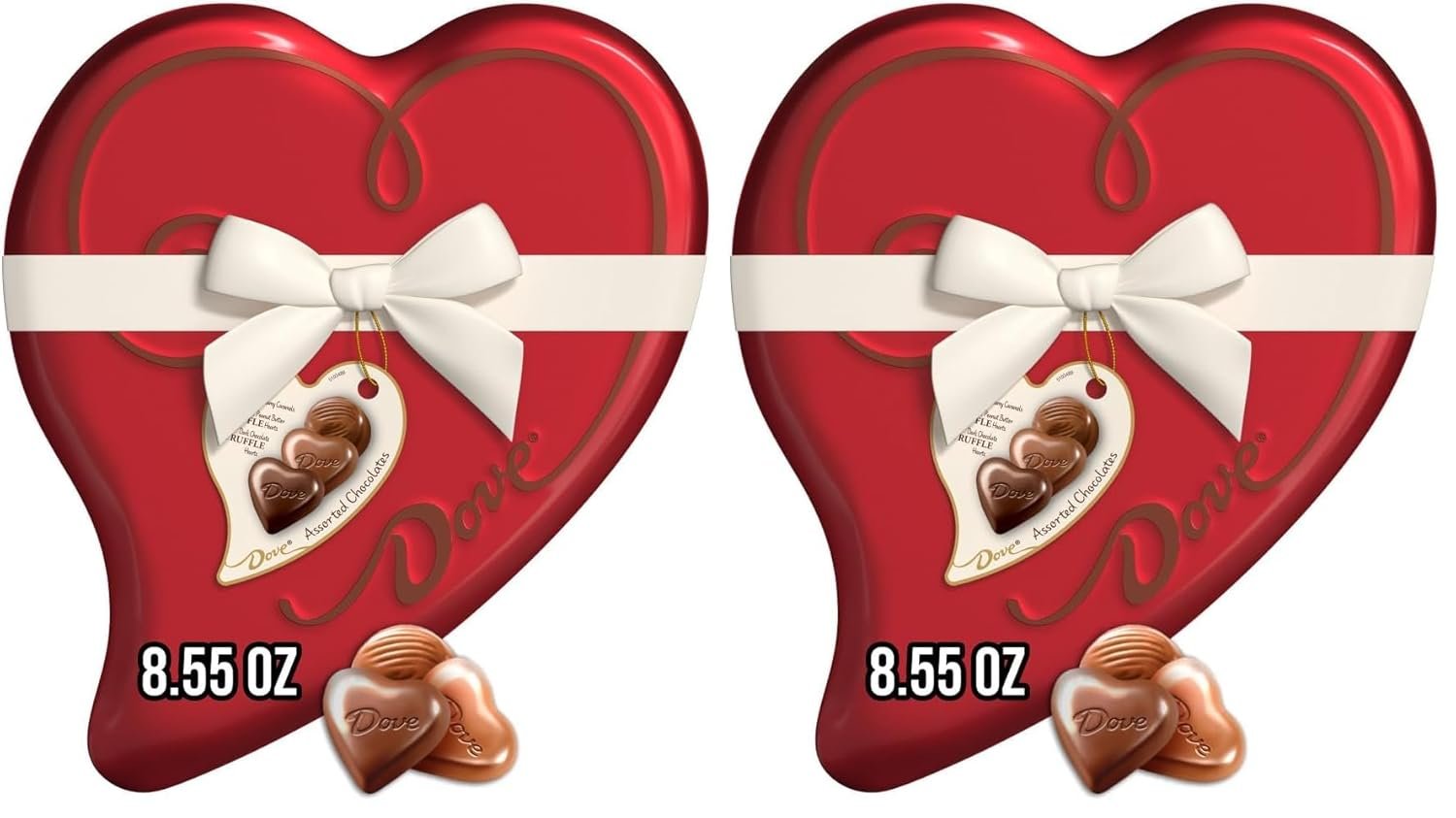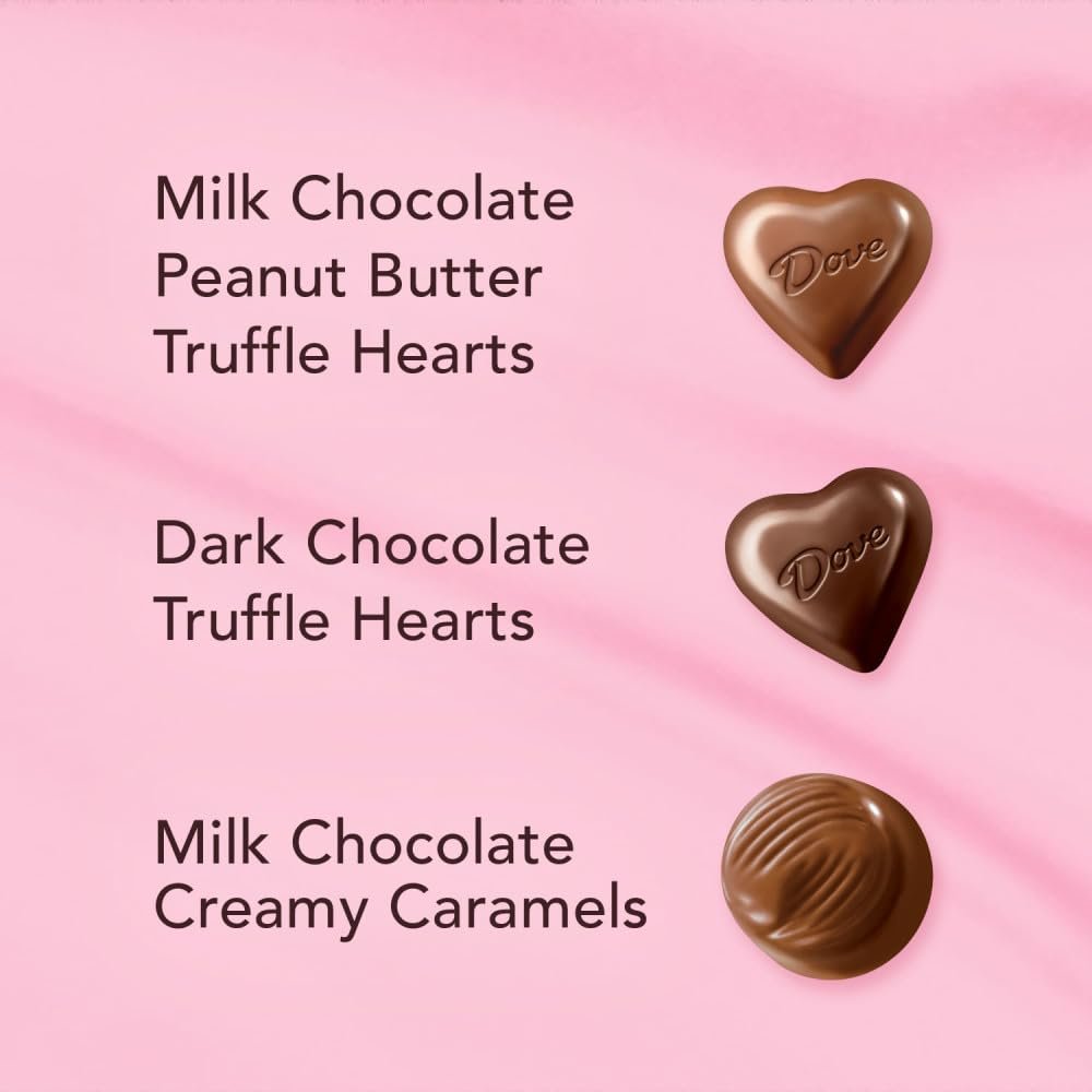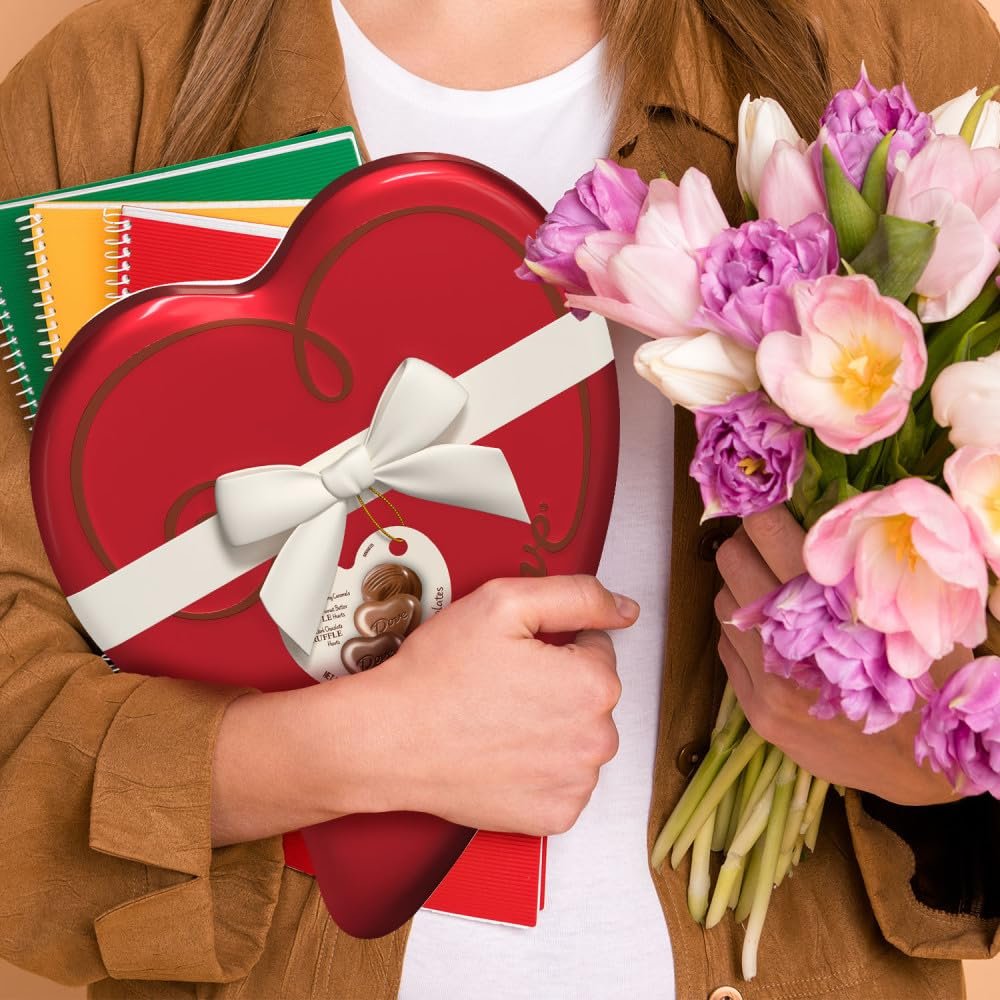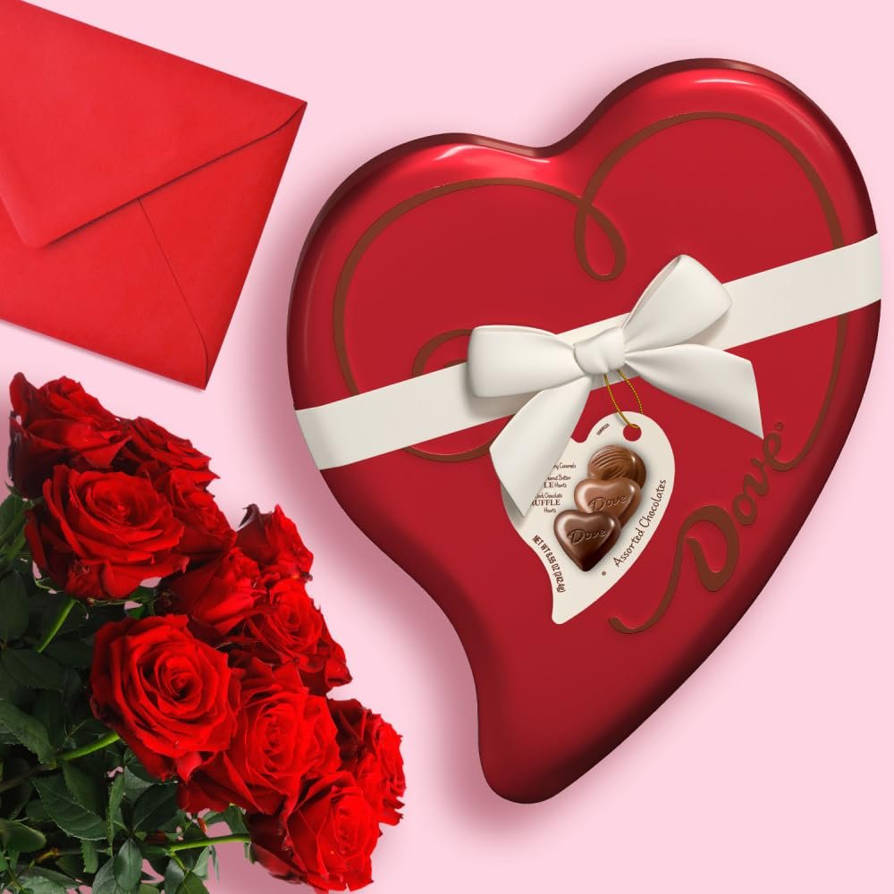 Contains one (1) 8.55-ounce heart-shaped tin of DOVE Truffle Valentine’s Day Assorted Chocolate Candy