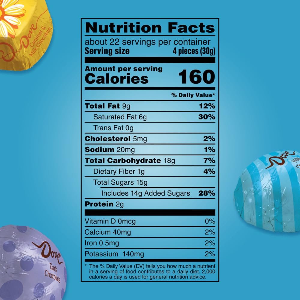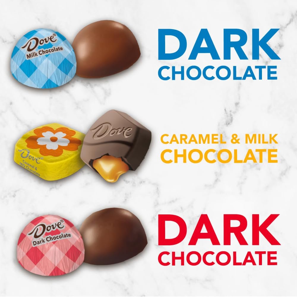 Each bag features a mix of milk chocolate, dark chocolate, and caramel and milk chocolate DOVE Candies