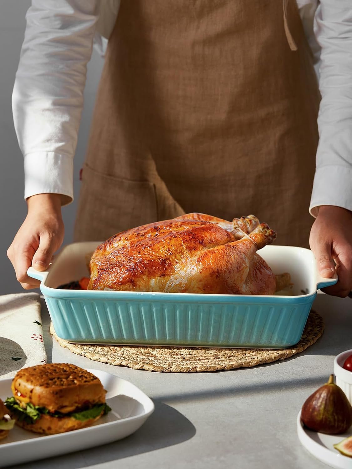 Durable and Safe: Made from lead-free and pro-grade ceramic, this 4.2 quarts extra-large casserole dish is designed for safe use and durability. It can withstand high temperatures without cracking or breaking, and it is safe to use in dishwashers, refrigerators, microwaves, and ovens up to 500°F/260°C.
