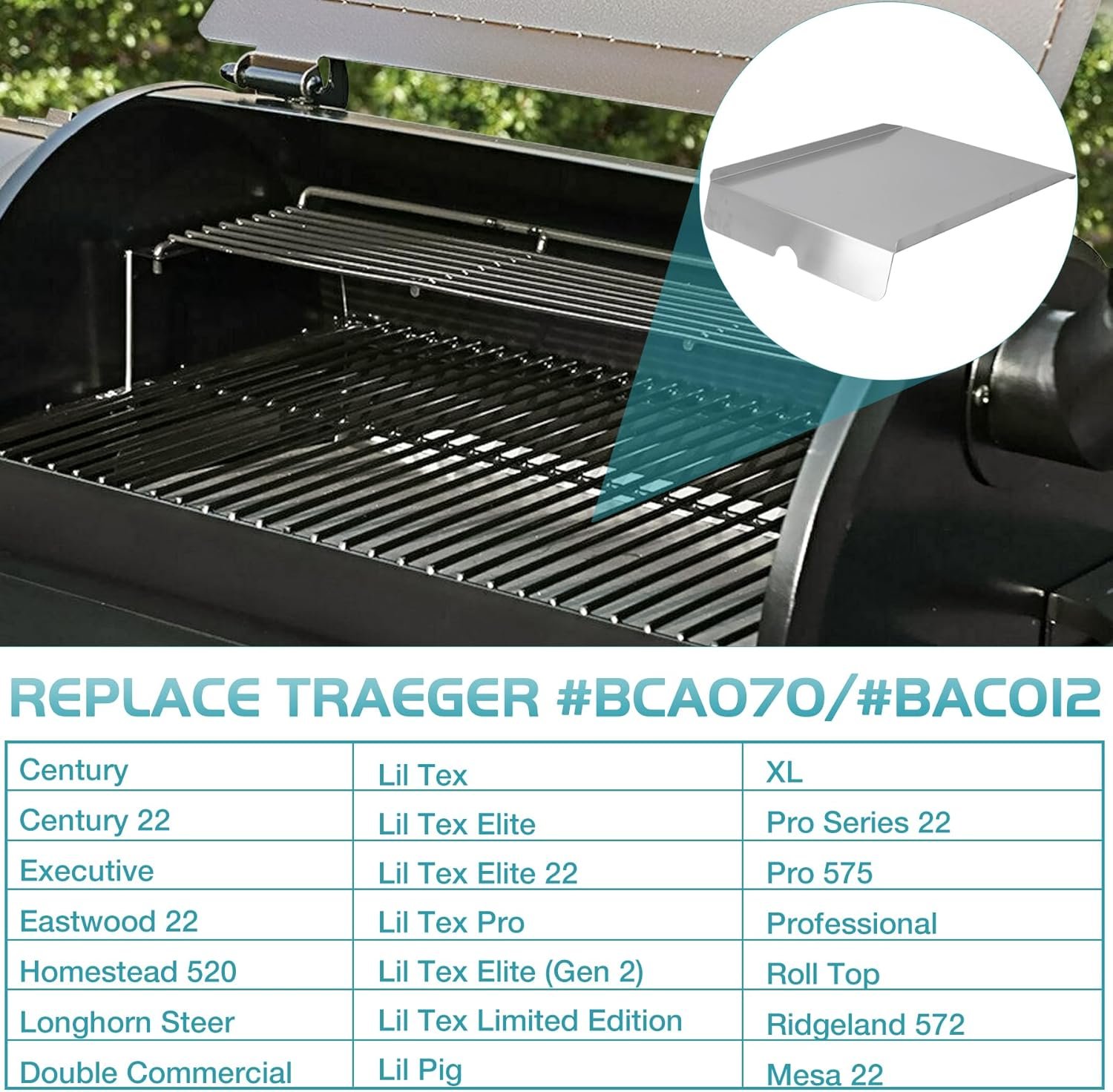 Unidanho grease drip tray heat baffle compatible with Traeger grill parts number: BCA070, BAC012. Fit for Traeger grill models: Century 22, Century, Double Commercial, Eastwood 22, Executive, Homestead 520, Lil Tex Elite (Gen 2), Lil Tex Limited Edition, Lil Tex Elite, Lil Tex, Lil Tex Pro, Lil Pig, Lil Tex Elite 22, Longhorn Steer, Mesa 22, Pro Series 22, XL, Professional, Ridgeland 572, Roll Top.