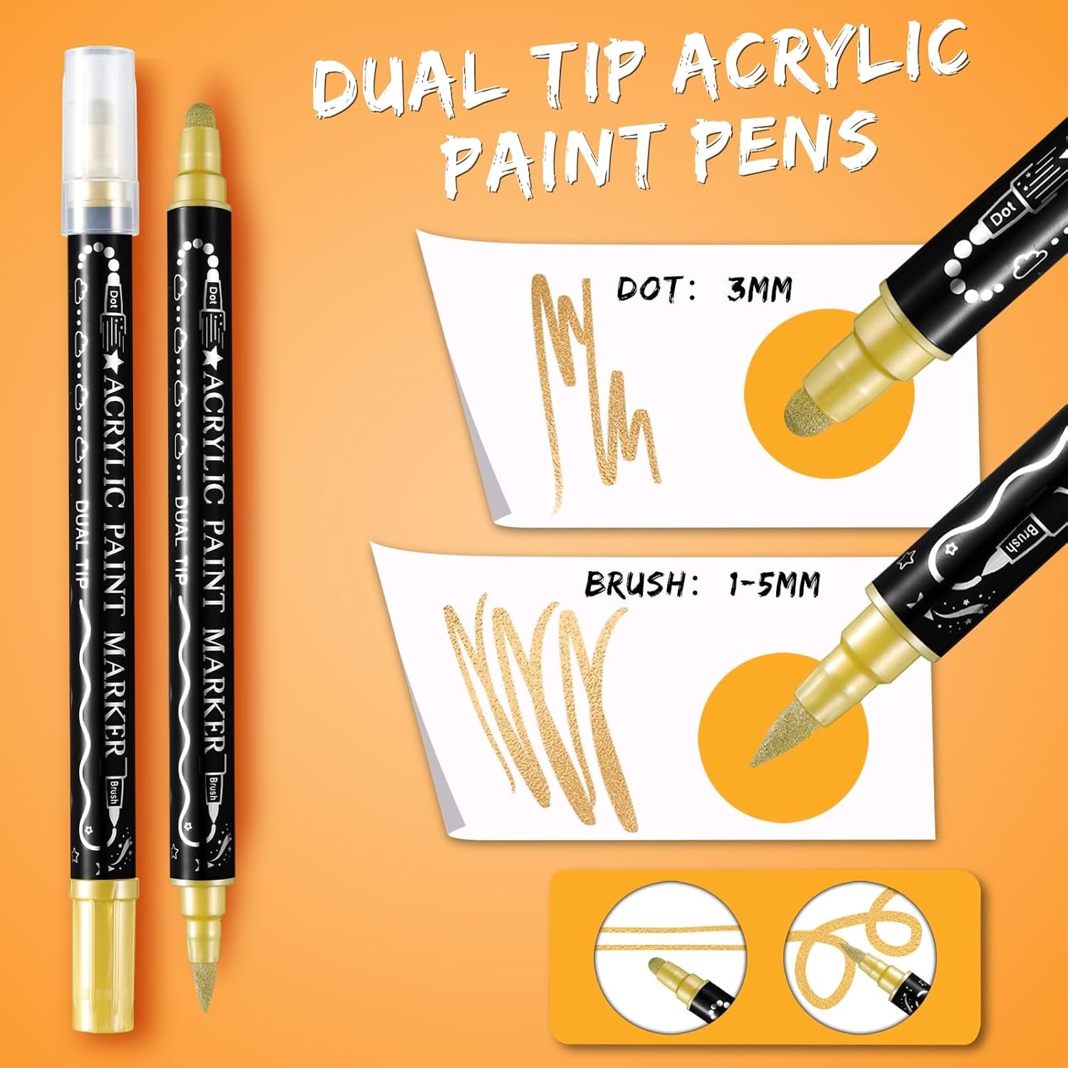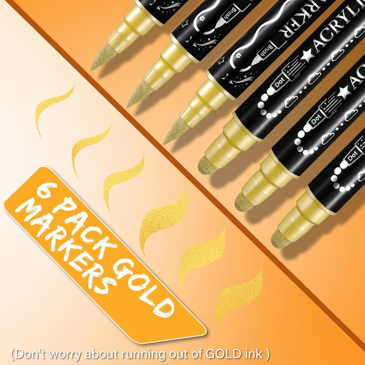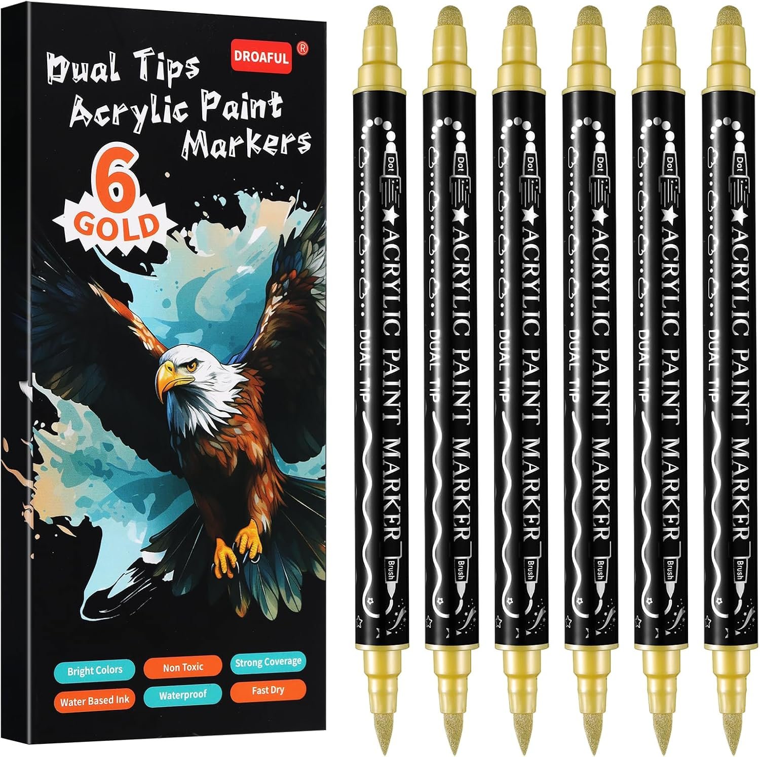 Droaful Glod Acrylic Paint Pens Markers, 6 Pc Dual Tips Waterproof Paint Markers For Rock Painting, Fabric, Metal, Glass, Wood, Canvas, Ceramic, Pumpkins, Eggs, Plastic, Non-Toxic & Odor
